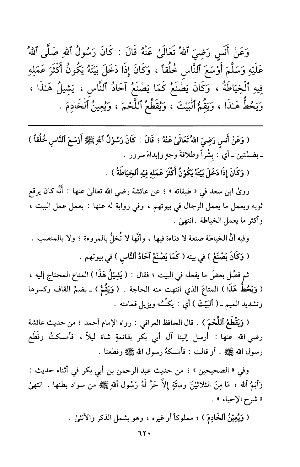 وعن أنس رضي الله تعالى عنه قال: كان رسول الله صلّى الله عليه وسلّم أوسع النّاس خلقا، وكان إذا دخل بيته يكون أكثر عمله فيه الخياطة، وكان يصنع كما يصنع آحاد النّاس، يشيل هذا، ويحطّ هذا، ويقمّ البيت، ويقطّع اللّحم، ويعين الخادم.