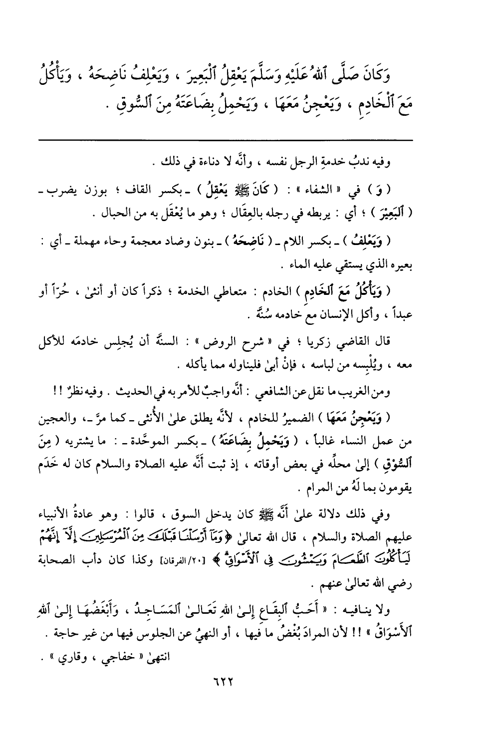 وكان صلّى الله عليه وسلّم يعقل البعير، ويعلف ناضحه، ويأكل مع الخادم، ويعجن معها، ويحمل بضاعته من السّوق.