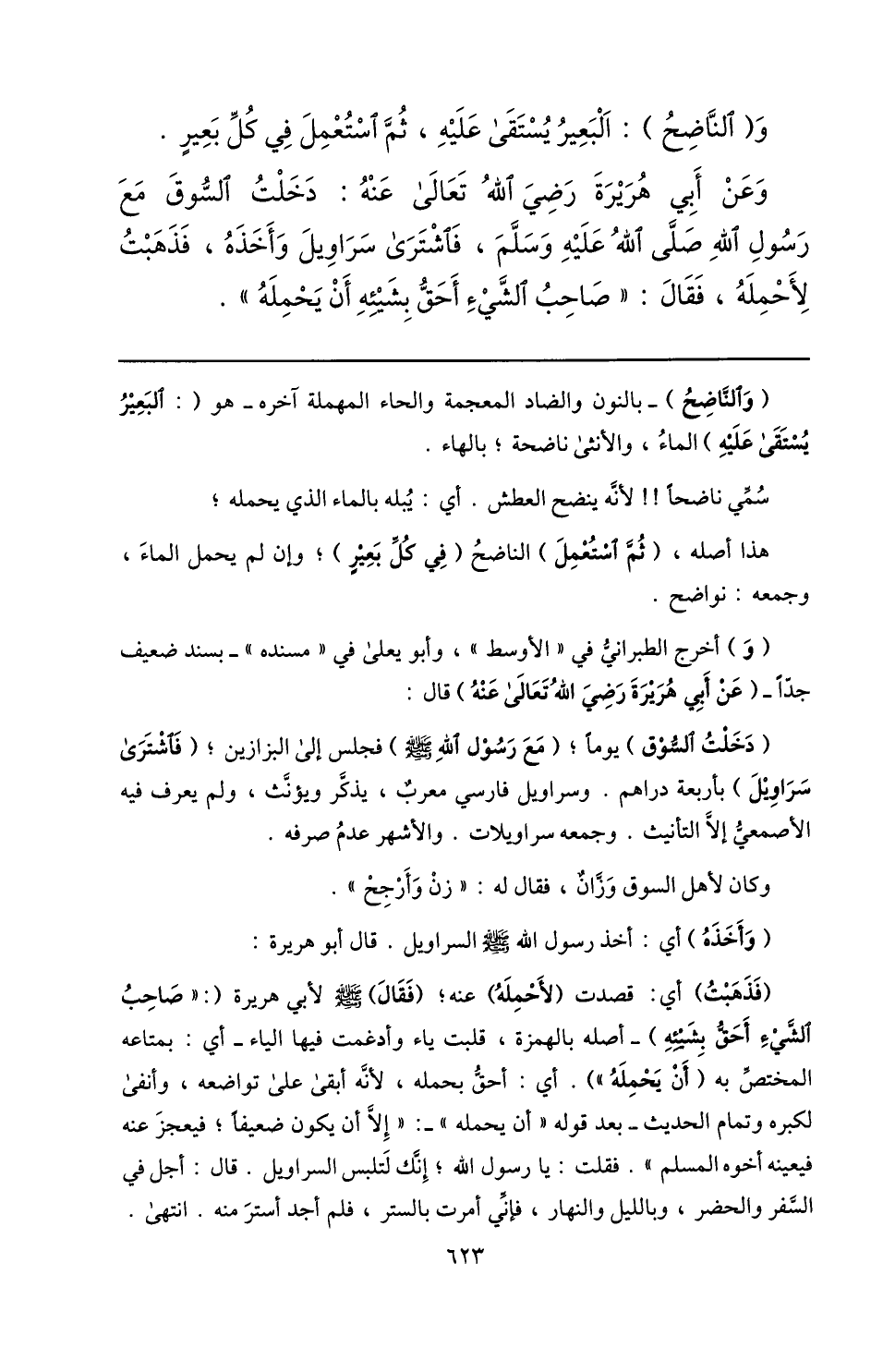 (فذهبت) أي: قصدت (لأحمله) عنه؛ (فقال) صلى الله عليه وسلم لأبي هريرة (: «صاحب الشّيء أحقّ بشيئه) - أصله بالهمزة، قلبت ياء وأدغمت فيها الياء- أي: بمتاعه المختصّ به (أن يحمله» ) . أي: أحقّ بحمله، لأنّه أبقى على تواضعه، وأنفى لكبره وتمام الحديث- بعد قوله «أن يحمله» -: «إلّا أن يكون ضعيفا؛ فيعجز عنه فيعينه أخوه المسلم» . فقلت: يا رسول الله؛ إنّك لتلبس السراويل. قال: أجل في السّفر والحضر، وبالليل والنهار، فإنّي أمرت بالستر، فلم أجد أستر منه. انتهى.