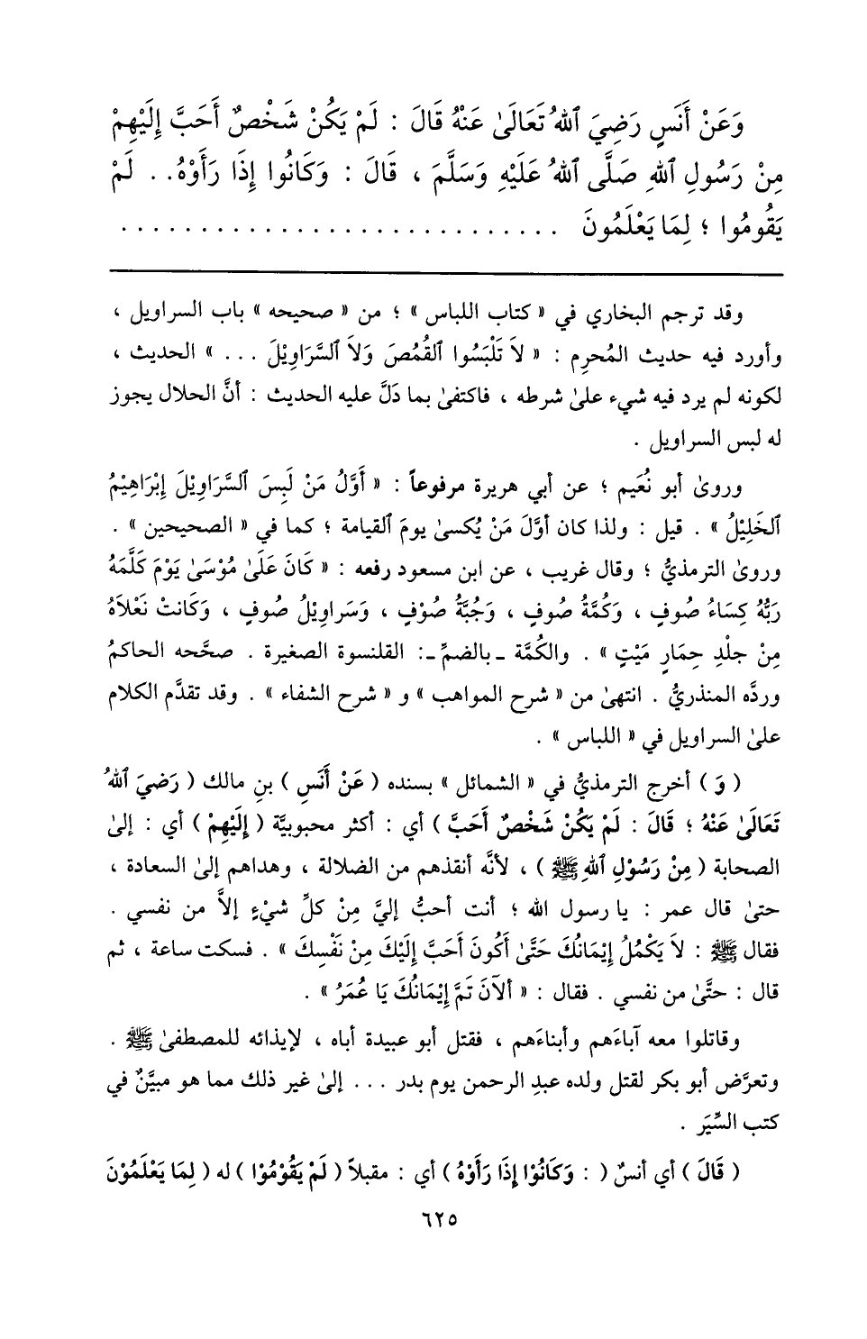 وروى الترمذيّ؛ وقال غريب، عن ابن مسعود رفعه: «كان على موسى يوم كلّمه ربّه كساء صوف، وكمّة صوف، وجبّة صوف، وسراويل صوف، وكانت نعلاه من جلد حمار ميت» . والكمّة- بالضمّ-: القلنسوة الصغيرة. صحّحه الحاكم وردّه المنذريّ. انتهى من «شرح المواهب» و «شرح الشفاء» . وقد تقدّم الكلام على السراويل في «اللباس» .