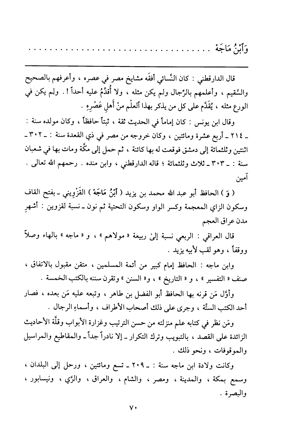 وابن ماجه: الحافظ إمام كبير من أئمة المسلمين، متقن مقبول بالاتفاق، صنف «التفسير» ، و «التاريخ» ، و «السنن» وتقرن سننه بالكتب الخمسة.