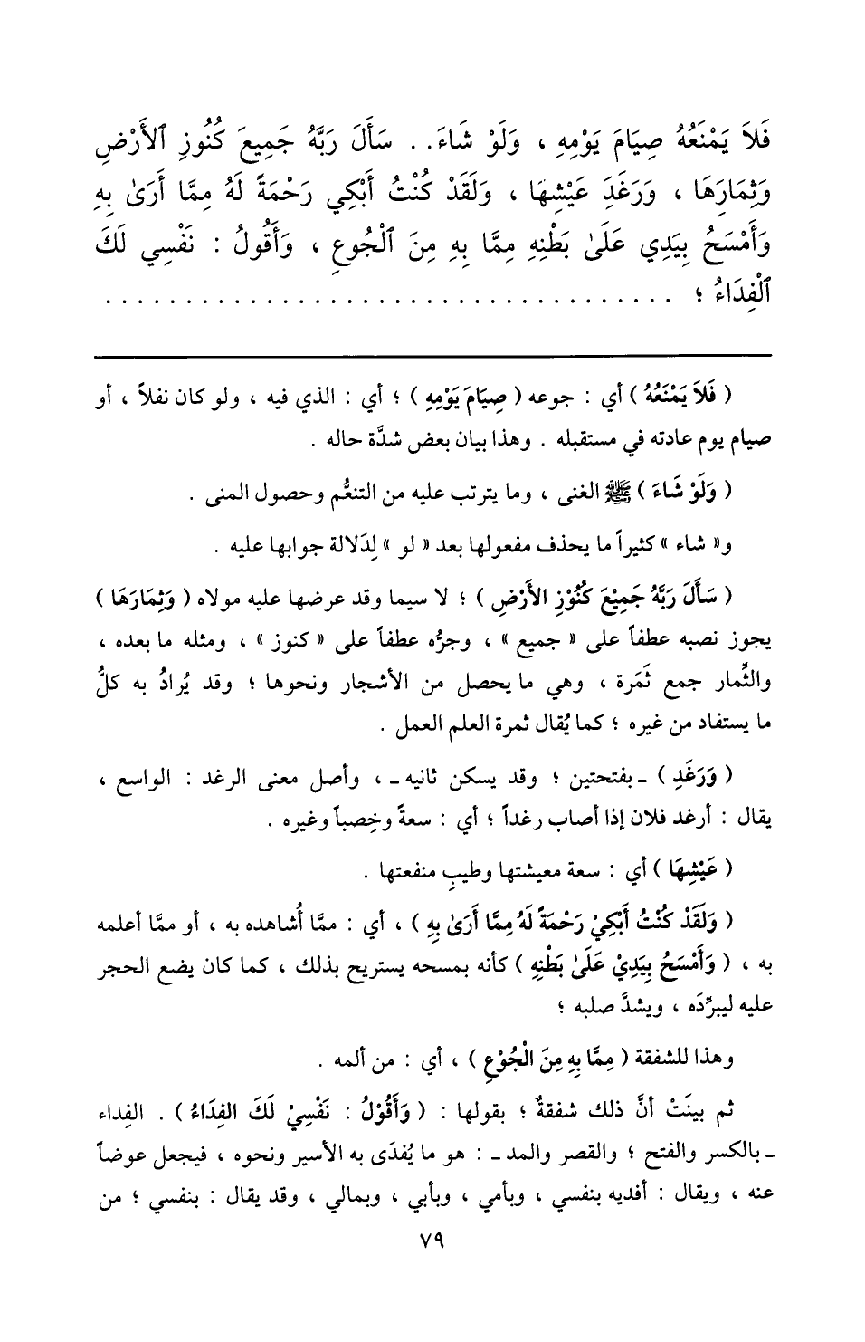فلا يمنعه صيام يومه، ولو شاء.. سأل ربّه جميع كنوز الأرض وثمارها، ورغد عيشها، ولقد كنت أبكي رحمة له ممّا أرى به وأمسح بيدي على بطنه ممّا به من الجوع، وأقول: نفسي لك الفداء؛ ...
