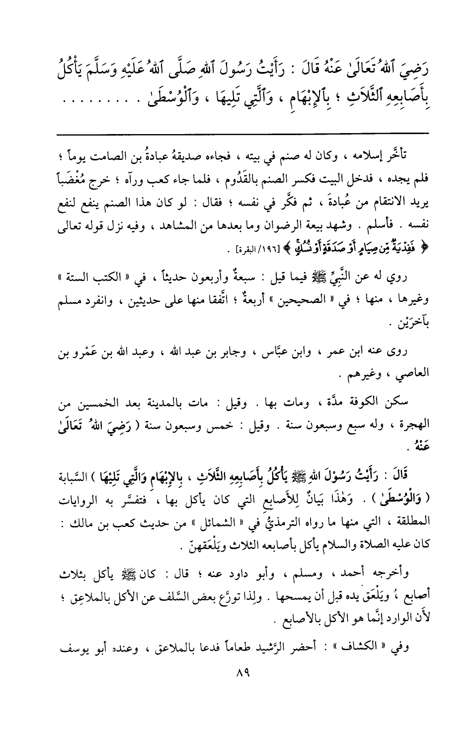 قال: رأيت رسول الله صلّى الله عليه وسلم يأكل بأصابعه الثّلاث، بالإبهام والّتي تليها) السّبابة (والوسطى) . وهذا بيان للأصابع التي كان يأكل بها، فتفسّر به الروايات المطلقة، التي منها ما رواه الترمذيّ في «الشمائل» من حديث كعب بن مالك: