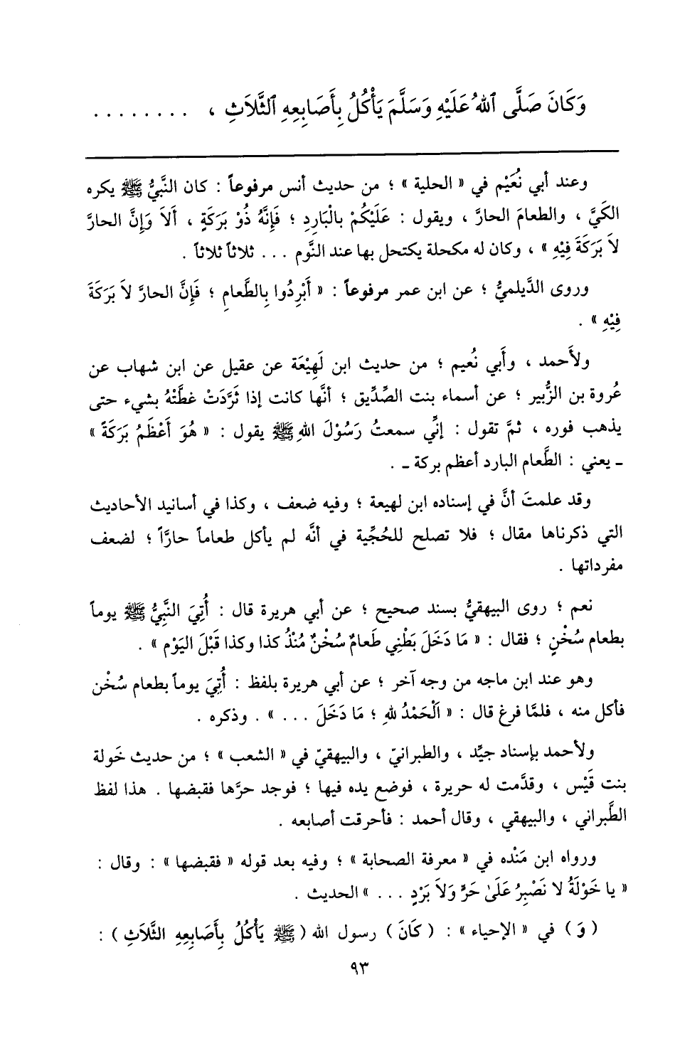وكان صلّى الله عليه وسلّم يأكل بأصابعه الثّلاث، ...