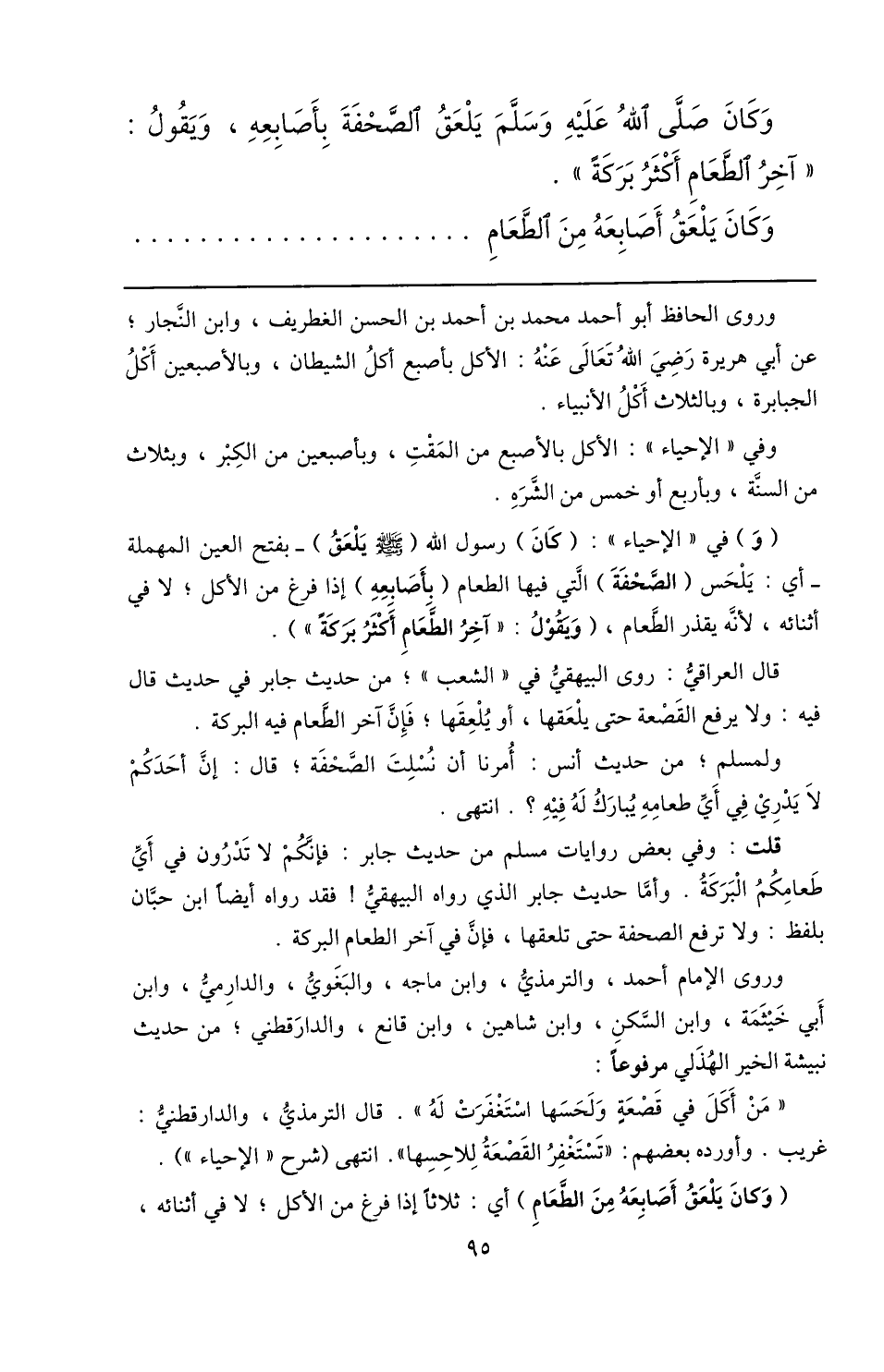 (و) في «الإحياء» : (كان) رسول الله (صلّى الله عليه وسلّم يلعق) - بفتح العين المهملة- أي: يلحس (الصّحفة) الّتي فيها الطعام (بأصابعه) إذا فرغ من الأكل؛ لا في أثنائه، لأنّه يقذر الطّعام، (ويقول: «آخر الطّعام أكثر بركة» ) .