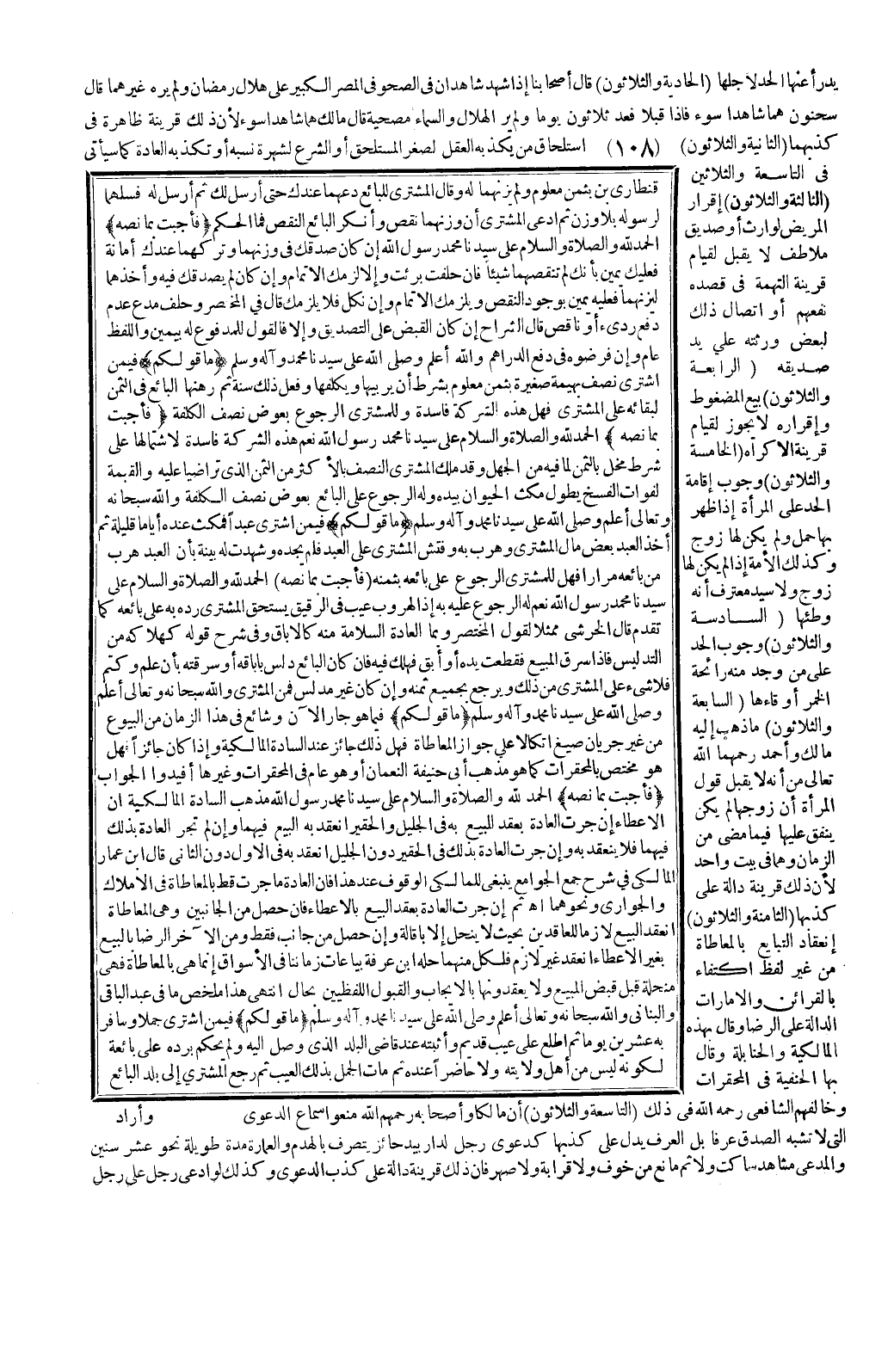 (فَأَجَابَ بِمَا نَصُّهُ) الْحَمْدُ لِلَّهِ قَالَ فِي التَّبْصِرَةِ فَرْعٌ، وَمَنْ ادَّعَى عَلَى رَجُلٍ أَنَّهُ ابْتَاعَ مِنْهُ سِلْعَةً، وَأَنْكَرَ الْبَائِعُ وَشَهِدَتْ عَلَى ذَلِكَ بَيِّنَةٌ لَمْ تُعَرِّفْ الثَّمَنَ فَالشَّهَادَةُ تَامَّةٌ عِنْدَ مَالِكٍ، وَيُقَالُ لِلْبَائِعِ قَدْ ثَبَتَ الْبَيْعُ فَبِكَمْ بِعْتهَا فَإِنْ سَمَّى ثَمَنًا اعْتَرَفَ بِهِ الْمُبْتَاعُ أَدَّاهُ، وَإِنْ ادَّعَى دُونَهُ تَحَالَفَا، وَرُدَّتْ، وَإِنْ تَمَادَى الْبَائِعُ عَلَى إنْكَارِ الْبَيْعِ سُئِلَ الْمُبْتَاعُ عَنْ الثَّمَنِ فَإِنْ سَمَّى مَا يُشْبِهُ حَلَفَ، وَدَفَعَ مَا حَلَفَ عَلَيْهِ اهـ.