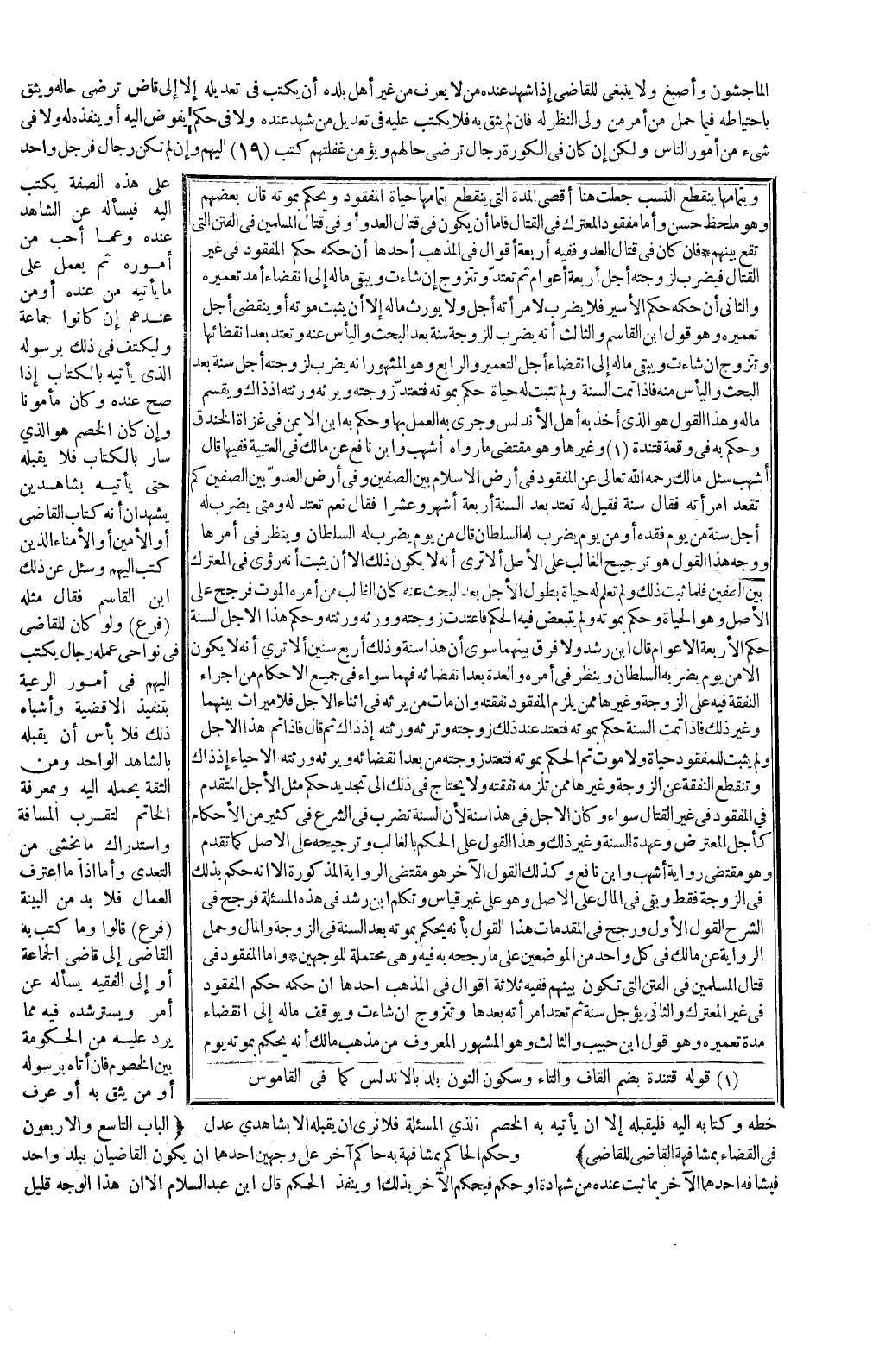 فَأَجَبْتُ بِمَا نَصُّهُ: الْحَمْدُ لِلَّهِ، وَالصَّلَاةُ وَالسَّلَامُ عَلَى سَيِّدِنَا مُحَمَّدٍ رَسُولِ اللَّهِ نَعَمْ تَرْفَعُ لِلْحَاكِمِ إنْ كَانَ، وَإِلَّا فَلِجَمَاعَةِ الْمُسْلِمِينَ، ثُمَّ إنْ كَانَ زَوْجُهَا مَعْلُومَ الْمَكَانِ أَرْسَلَ إلَيْهِ إمَّا أَنْ يَقْدَمَ أَوْ يَحْمِلَهَا إلَيْهِ أَوْ يُطَلِّقَ، وَإِلَّا طَلَّقَ عَلَيْهِ، وَإِنْ كَانَ مَجْهُولَ الْمَكَانِ أَرْسَلَ إلَى الْجِهَاتِ الَّتِي يُظَنُّ ذَهَابُهُ إلَيْهَا فَإِنْ عُلِمَ مَحَلُّهُ فَكَالْأَوَّلِ، وَإِنْ عَجَزَ عَنْ خَبَرِهِ أُجِّلَتْ أَرْبَعَ سِنِينَ إنْ كَانَ حُرًّا، وَسَنَتَيْنِ إنْ كَانَ رِقًّا، وَإِذَا تَمّ الْأَجَلُ اعْتَدَّتْ عِدَّةَ، وَفَاةٍ، ثُمَّ تَزَوَّجَتْ إنْ شَاءَتْ، وَهَذَا كُلُّهُ إنْ دَامَتْ نَفَقَتُهَا مِنْ مَالِهِ، وَلَمْ تَخْشَ عَلَى نَفْسِهَا زِنًا