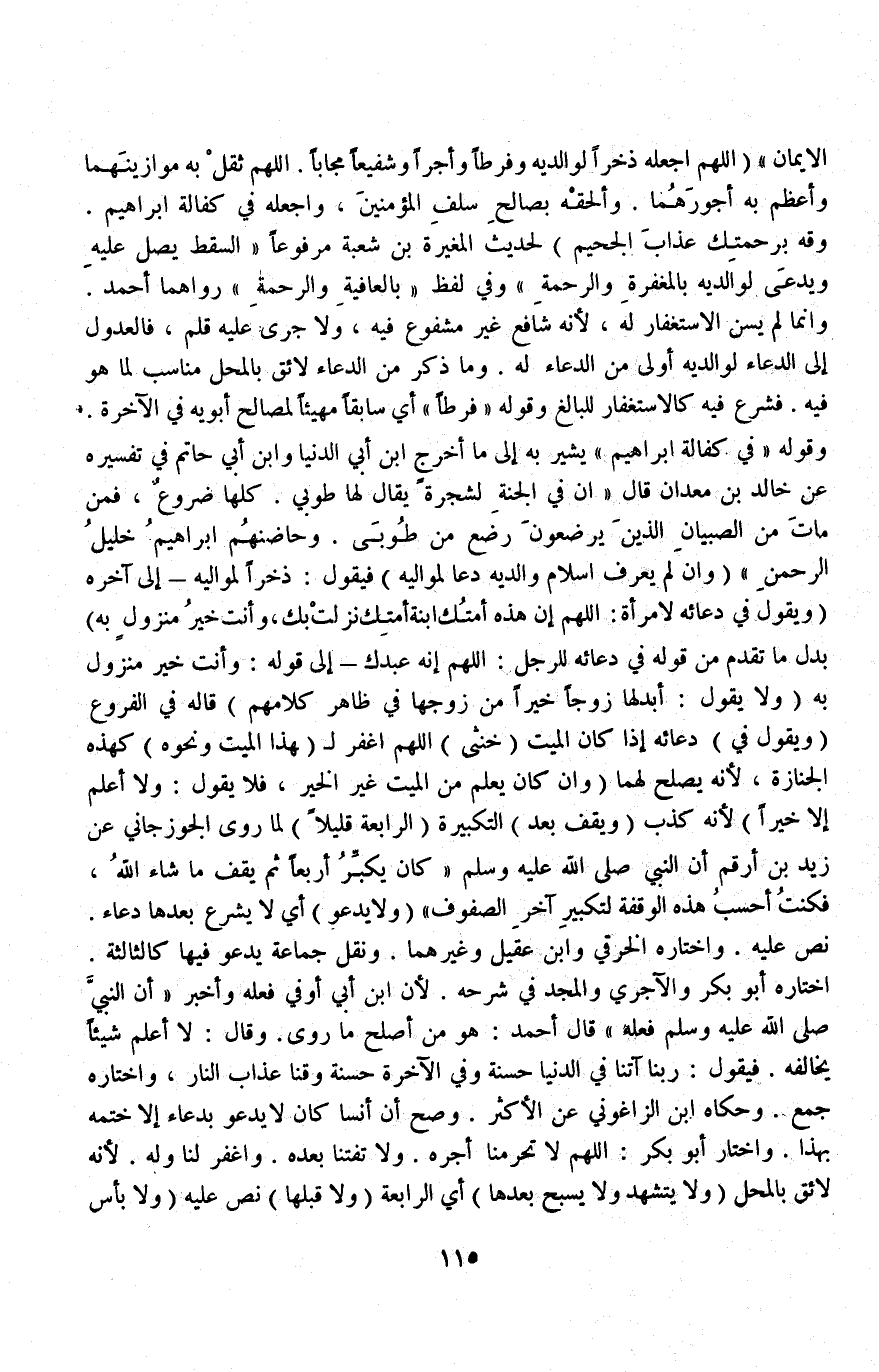 الْإِيمَانِ " (اللَّهُمَّ اجْعَلْهُ ذُخْرًا لِوَالِدَيْهِ وَفَرَطًا وَأَجْرًا وَشَفِيعًا مُجَابًا اللَّهُمَّ ثَقِّلْ بِهِ مَوَازِينَهُمَا وَأَعْظِمْ بِهِ أُجُورَهُمَا وَأَلْحِقْهُ بِصَالِحِ سَلَفِ الْمُؤْمِنِينَ، وَاجْعَلْهُ فِي كَفَالَةِ إبْرَاهِيمَ وَقِه بِرَحْمَتِكَ عَذَابَ الْجَحِيمِ) لِحَدِيثِ الْمُغِيرَةِ بْنِ شُعْبَةَ مَرْفُوعًا «السَّقْطُ يُصَلَّى عَلَيْهِ وَيُدْعَى لِوَالِدَيْهِ بِالْمَغْفِرَةِ وَالرَّحْمَةِ» .