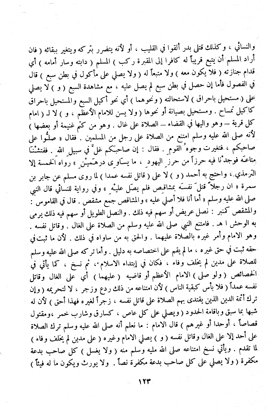 وَفِي رِوَايَةٍ لِلنَّسَائِيِّ قَالَ النَّبِيُّ - صَلَّى اللَّهُ عَلَيْهِ وَسَلَّمَ -: «أَمَّا أَنَا فَلَا أُصَلِّي عَلَيْهِ» وَالْمَشَاقِصُ جَمْعُ مِشْقَصٍ قَالَ فِي الْقَامُوسِ: وَالْمِشْقَصُ كَمِنْبَرٍ: نَصْلٌ عَرِيضٌ أَوْ سَهْمٌ فِيهِ ذَلِكَ وَالنَّصْلُ الطَّوِيلُ أَوْ سَهْمٌ فِيهِ ذَلِكَ يُرْمَى بِهِ الْوَحْشُ اهـ فَامْتَنَعَ النَّبِيُّ - صَلَّى اللَّهُ عَلَيْهِ وَسَلَّمَ - مِنْ الصَّلَاةِ عَلَى الْغَالِّ وَقَاتِلِ نَفْسِهِ وَهُوَ الْإِمَامُ وَأَمَرَ غَيْرَهُ بِالصَّلَاةِ عَلَيْهِمَا وَأُلْحِقَ بِهِ مَنْ سَاوَاهُ فِي ذَلِكَ لِأَنَّ مَا ثَبَتَ فِي حَقِّهِ ثَبَتَ فِي حَقِّ غَيْرِهِ، مَا لَمْ يَقُمْ عَلَى اخْتِصَاصِهِ بِهِ دَلِيلٌ وَأَمَّا تَرْكُهُ - صَلَّى اللَّهُ عَلَيْهِ وَسَلَّمَ - لِلصَّلَاةِ عَلَى مَدِينٍ لَمْ يُخْلِفْ وَفَاءً، فَكَانَ فِي ابْتِدَاءِ الْإِسْلَامِ، ثُمَّ نُسِخَ، كَمَا يَأْتِي فِي الْخَصَائِصِ.