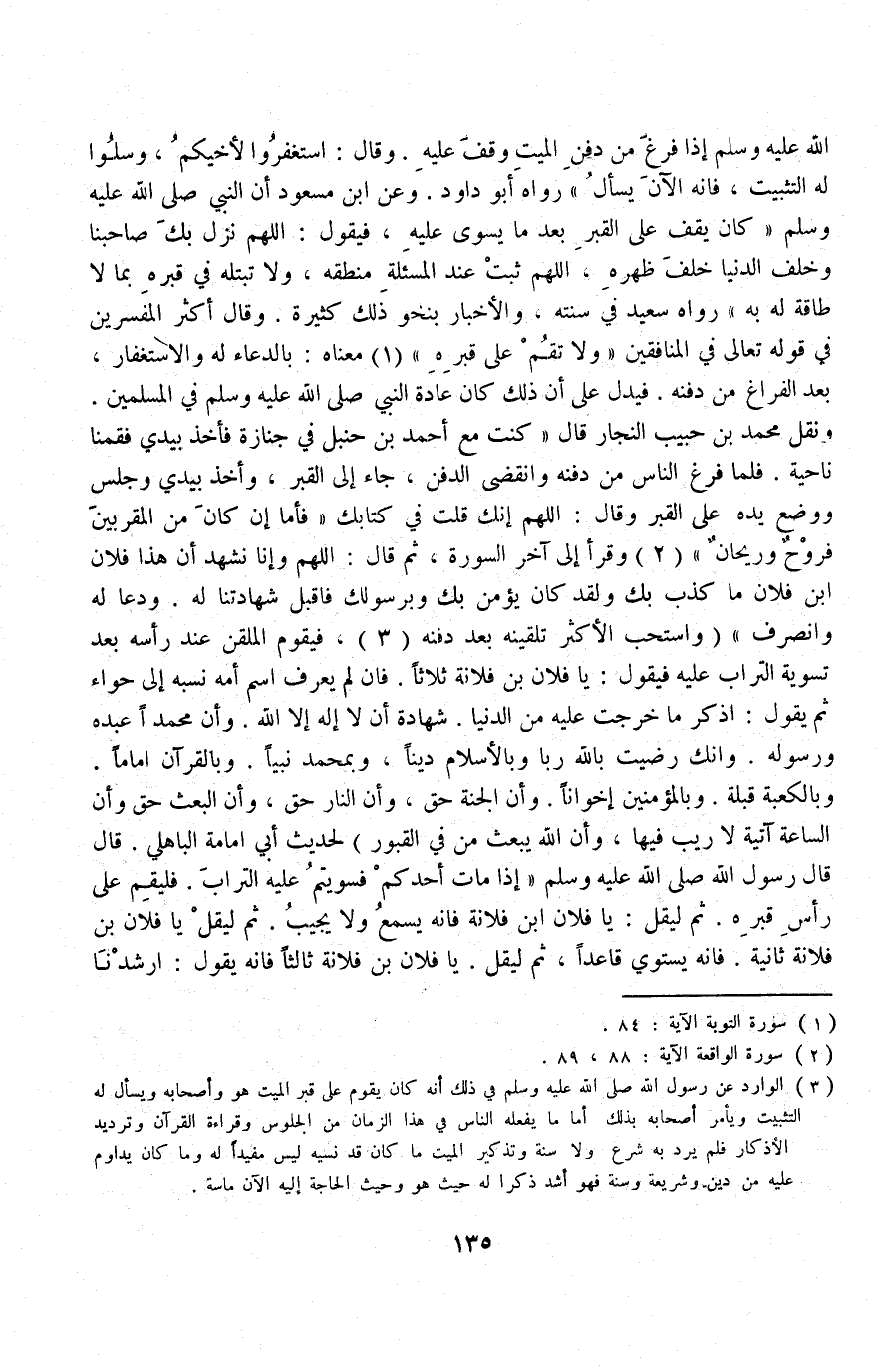 إذَا فَرَغَ مِنْ دَفْنِ الْمَيِّتِ وَقَفَ عَلَيْهِ وَقَالَ: اسْتَغْفِرُوا لِأَخِيكُمْ وَسَلُوا لَهُ التَّثْبِيتَ فَإِنَّهُ الْآنَ يُسْأَلُ» رَوَاهُ أَبُو دَاوُد وَعَنْ ابْنِ مَسْعُودٍ أَنَّ النَّبِيَّ - صَلَّى اللَّهُ عَلَيْهِ وَسَلَّمَ - «كَانَ يَقِفُ عَلَى الْقَبْرِ بَعْدَ مَا يُسَوِّي عَلَيْهِ، فَيَقُولُ: اللَّهُمَّ نَزَلَ بِكَ صَاحِبُنَا وَخَلَّفَ الدُّنْيَا خَلْفَ ظَهْرِهِ، اللَّهُمَّ ثَبِّتْ عِنْدَ الْمَسْأَلَةِ مَنْطِقَهُ، وَلَا تَبْتَلِهِ فِي قَبْرِهِ بِمَا لَا طَاقَةَ لَهُ بِهِ» رَوَاهُ سَعِيدٌ فِي سُنَنِهِ وَالْأَخْبَارُ بِنَحْوِ ذَلِكَ كَثِيرَةٌ وَقَالَ أَكْثَرُ الْمُفَسِّرِينَ فِي قَوْله تَعَالَى فِي الْمُنَافِقِينَ: {وَلا تَقُمْ عَلَى قَبْرِهِ} [التوبة: ٨٤] مَعْنَاهُ: بِالدُّعَاءِ لَهُ وَالِاسْتِغْفَارِ، بَعْدَ الْفَرَاغِ مِنْ دَفْنِهِ فَيَدُلُّ عَلَى أَنَّ ذَلِكَ كَانَ عَادَةَ النَّبِيِّ - صَلَّى اللَّهُ عَلَيْهِ وَسَلَّمَ - فِي الْمُسْلِمِينَ وَنَقَلَ مُحَمَّدُ بْنُ حَبِيبٍ النَّجَّارُ قَالَ " كُنْتُ مَعَ أَحْمَدَ بْنِ حَنْبَلٍ فِي جِنَازَةٍ فَأَخَذَ بِيَدِي فَقُمْنَا نَاحِيَةً فَلَمَّا فَرَغَ النَّاسُ مِنْ دَفْنِهِ وَانْقَضَى الدَّفْنُ، جَاءَ إلَى الْقَبْرِ، وَأَخَذَ بِيَدِي وَجَلَسَ وَوَضَعَ يَدَهُ عَلَى الْقَبْرِ وَقَالَ: اللَّهُمَّ إنَّكَ قُلْتَ فِي كِتَابِكَ {فَأَمَّا إِنْ كَانَ مِنَ الْمُقَرَّبِينَ} [الواقعة: ٨٨] {فَرَوْحٌ وَرَيْحَانٌ} [الواقعة: ٨٩] وَقَرَأَ إلَى آخِرِ السُّورَةِ، ثُمَّ قَالَ: " اللَّهُمَّ وَإِنَّا نَشْهَدُ أَنَّ هَذَا فُلَانَ بْنَ فُلَانٍ مَا كَذَّبَ بِكَ وَلَقَدْ كَانَ يُؤْمِنُ بِكَ وَبِرَسُولِكَ فَاقْبَلْ شَهَادَتَنَا لَهُ وَدَعَا لَهُ وَانْصَرَفَ ".