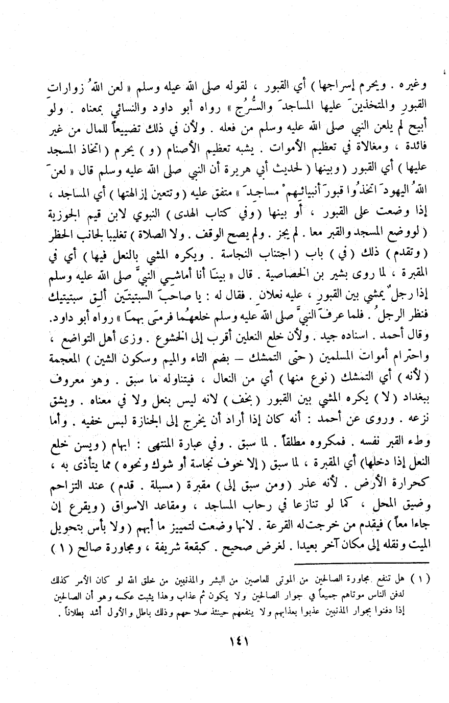 وَغَيْرُهُ وَيَحْرُمُ إسْرَاجُهَا) أَيْ: الْقُبُورِ، لِقَوْلِهِ - صَلَّى اللَّهُ عَلَيْهِ وَسَلَّمَ -: «لَعَنَ اللَّهُ زَوَّارَاتِ الْقُبُورِ وَالْمُتَّخِذِينَ عَلَيْهَا الْمَسَاجِدَ وَالسُّرُجَ» رَوَاهُ أَبُو دَاوُد وَالنَّسَائِيُّ بِمَعْنَاهُ وَلَوْ أُبِيحَ لَمْ يَلْعَنْ النَّبِيُّ - صَلَّى اللَّهُ عَلَيْهِ وَسَلَّمَ - مَنْ فَعَلَهُ وَلِأَنَّ فِي ذَلِكَ تَضْيِيعًا لِلْمَالِ مِنْ غَيْرِ فَائِدَةٍ، وَمُغَالَاةً فِي تَعْظِيمِ الْأَمْوَاتِ يُشْبِهُ تَعْظِيمَ الْأَصْنَامِ.