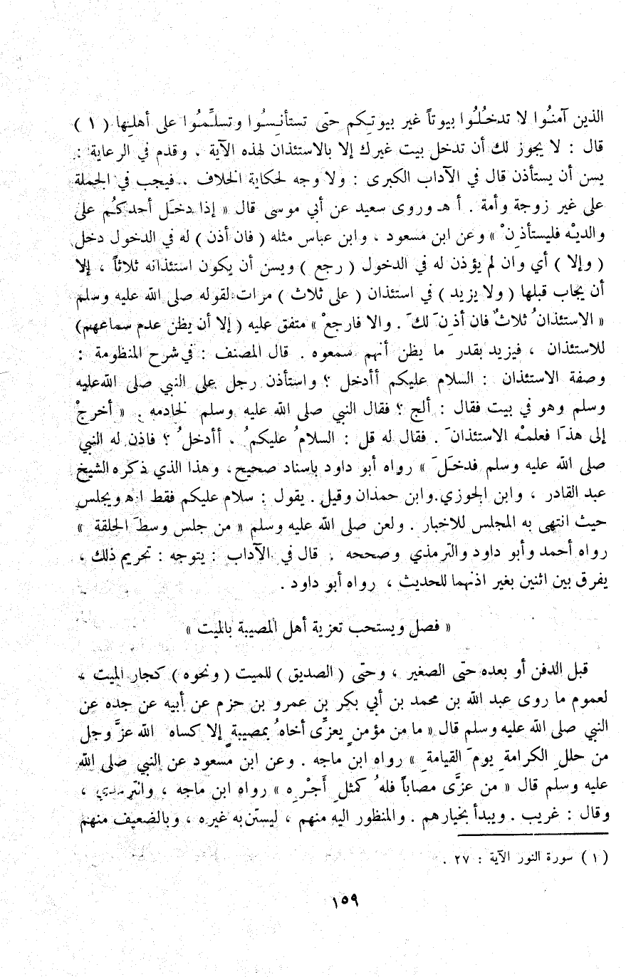 قَالَ: لَا يَجُوزُ لَك أَنْ تَدْخُلَ بَيْتَ غَيْرِكَ إلَّا بِالِاسْتِئْذَانِ لِهَذِهِ الْآيَةِ وَقَدَّمَ فِي الرِّعَايَةِ يُسَنُّ أَنْ يَسْتَأْذِنَ قَالَ فِي الْآدَابِ الْكُبْرَى: وَلَا وَجْهَ لِحِكَايَةِ الْخِلَافِ فَيَجِبُ فِي الْجُمْلَةِ عَلَى غَيْرِ زَوْجَةٍ وَأَمَةٍ اهـ وَرَوَى سَعِيد عَنْ أَبِي مُوسَى قَالَ " إذَا دَخَلَ أَحَدُكُمْ عَلَى وَالِدَيْهِ فَلْيَسْتَأْذِنْ " وَعَنْ ابْنِ مَسْعُودٍ وَابْنِ عَبَّاسٍ مِثْله (فَإِنْ أُذِنَ لَهُ) فِي الدُّخُولِ دَخَلَ (وَإِلَّا) أَيْ: وَإِنْ لَمْ يُؤْذَنْ لَهُ فِي الدُّخُولِ (رَجَعَ) وَيُسَنُّ أَنْ يَكُونَ اسْتِئْذَانُهُ ثَلَاثًا، إلَّا أَنْ يُجَابَ قَبْلَهَا (وَلَا يَزِيدُ) فِي اسْتِئْذَانِ (عَلَى ثَلَاثِ) مَرَّاتٍ لِقَوْلِهِ: «- صَلَّى اللَّهُ عَلَيْهِ وَسَلَّمَ - الِاسْتِئْذَانُ ثَلَاثٌ فَإِنْ أُذِنَ لَك وَإِلَّا فَارْجِعْ» مُتَّفَقٌ عَلَيْهِ (إلَّا أَنْ يَظُنَّ عَدَمَ سَمَاعِهِمْ) لِلِاسْتِئْذَانِ، فَيَزِيد بِقَدْرِ مَا يَظُنُّ أَنَّهُمْ سَمِعُوهُ قَالَ الْمُصَنِّفُ: فِي شَرْحِ الْمَنْظُومَةِ: وَصِفَةُ الِاسْتِئْذَانِ: السَّلَامُ عَلَيْكُمْ أَأَدْخُلُ؟ «وَاسْتَأْذَنَ رَجُلٌ عَلَى النَّبِيِّ - صَلَّى اللَّهُ عَلَيْهِ وَسَلَّمَ - وَهُوَ فِي بَيْتٍ فَقَالَ: أَلِجُ؟ فَقَالَ النَّبِيُّ - صَلَّى اللَّهُ عَلَيْهِ وَسَلَّمَ - لِخَادِمِهِ اُخْرُجْ إلَى هَذَا فَعَلِّمْهُ الِاسْتِئْذَانَ فَقَالَ لَهُ قُلْ: السَّلَامُ عَلَيْكُمْ أَأَدْخُلُ؟ فَأَذِنَ لَهُ النَّبِيُّ - صَلَّى اللَّهُ عَلَيْهِ وَسَلَّمَ - فَدَخَلَ» رَوَاهُ أَبُو دَاوُد بِإِسْنَادٍ صَحِيحٍ وَهَذَا الَّذِي ذَكَرَهُ الشَّيْخُ عَبْدُ الْقَادِرِ وَابْنُ الْجَوْزِيِّ وَابْنُ حَمْدَانَ وَقِيلَ يَقُولُ سَلَامٌ عَلَيْكُمْ فَقَطْ اهـ وَيَجْلِسُ حَيْثُ انْتَهَى بِهِ الْمَجْلِسِ لِلْأَخْبَارِ وَلَعَنَ - صَلَّى اللَّهُ عَلَيْهِ وَسَلَّمَ - مَنْ جَلَسَ وَسَطَ الْحَلْقَةِ رَوَاهُ أَحْمَدُ وَأَبُو دَاوُد وَالتِّرْمِذِيُّ وَصَحَّحَهُ قَالَ فِي الْآدَابِ: يُتَوَجَّهُ: تَحْرِيمُ ذَلِكَ يُفَرَّقُ بَيْنَ اثْنَيْنِ بِغَيْرِ إذْنِهِمَا لِلْحَدِيثِ رَوَاهُ أَبُو دَاوُد.