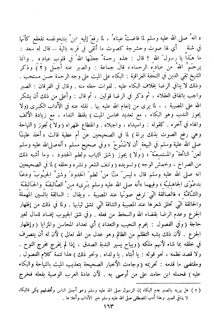 «أَنَّهُ - صَلَّى اللَّهُ عَلَيْهِ وَسَلَّمَ - لَمَّا فَاضَتْ عَيْنَاهُ، لَمَّا رُفِعَ إلَيْهِ ابْنُ بِنْتِهِ وَنَفْسُهُ تَقَعْقَعُ كَأَنَّهَا فِي شَنَّةٍ أَيْ: لَهَا صَوْتٌ وَحَشْرَجَةٌ كَصَوْتِ مَا أُلْقِيَ فِي قِرْبَةٍ بَالِيَةٍ قَالَ لَهُ سَعْدُ: مَا هَذَا يَا رَسُولَ اللَّهِ قَالَ: هَذِهِ رَحْمَةٌ جَعَلَهَا اللَّهُ فِي قُلُوبِ عِبَادِهِ وَإِنَّمَا يَرْحَمُ اللَّهُ مِنْ عِبَادِهِ الرُّحَمَاءَ» قَالَ جَمَاعَةٌ: وَالصَّبْرُ عَنْهُ أَجْمَلُ؟ وَذَكَرَ الشَّيْخُ تَقِيُّ الدِّينِ فِي التُّحْفَةِ الْعِرَاقِيَّةِ: الْبُكَاءُ عَلَى الْمَيِّتِ عَلَى وَجْهِ الرَّحْمَةِ حَسَنٌ مُسْتَحَبٌّ وَذَلِكَ لَا يُنَافِي الرِّضَا بِخِلَافِ الْبُكَاءِ عَلَيْهِ لِفَوَاتِ حَظِّهِ مِنْهُ وَقَالَ فِي الْفُرْقَانِ: الصَّبْرُ وَاجِبٌ بِاتِّفَاقِ الْعُقَلَاءِ، ثُمَّ ذَكَر فِي الرِّضَا قَوْلَيْنِ ثُمَّ قَالَ: وَأَعْلَى مِنْ ذَلِكَ أَنْ يَشْكُرَ اللَّهَ عَلَى الْمُصِيبَةِ، لِمَا يَرَى مِنْ إنْعَامِ اللَّهِ عَلَيْهِ بِهَا نَقَلَهُ عَنْهُ فِي الْآدَابِ الْكُبْرَى.