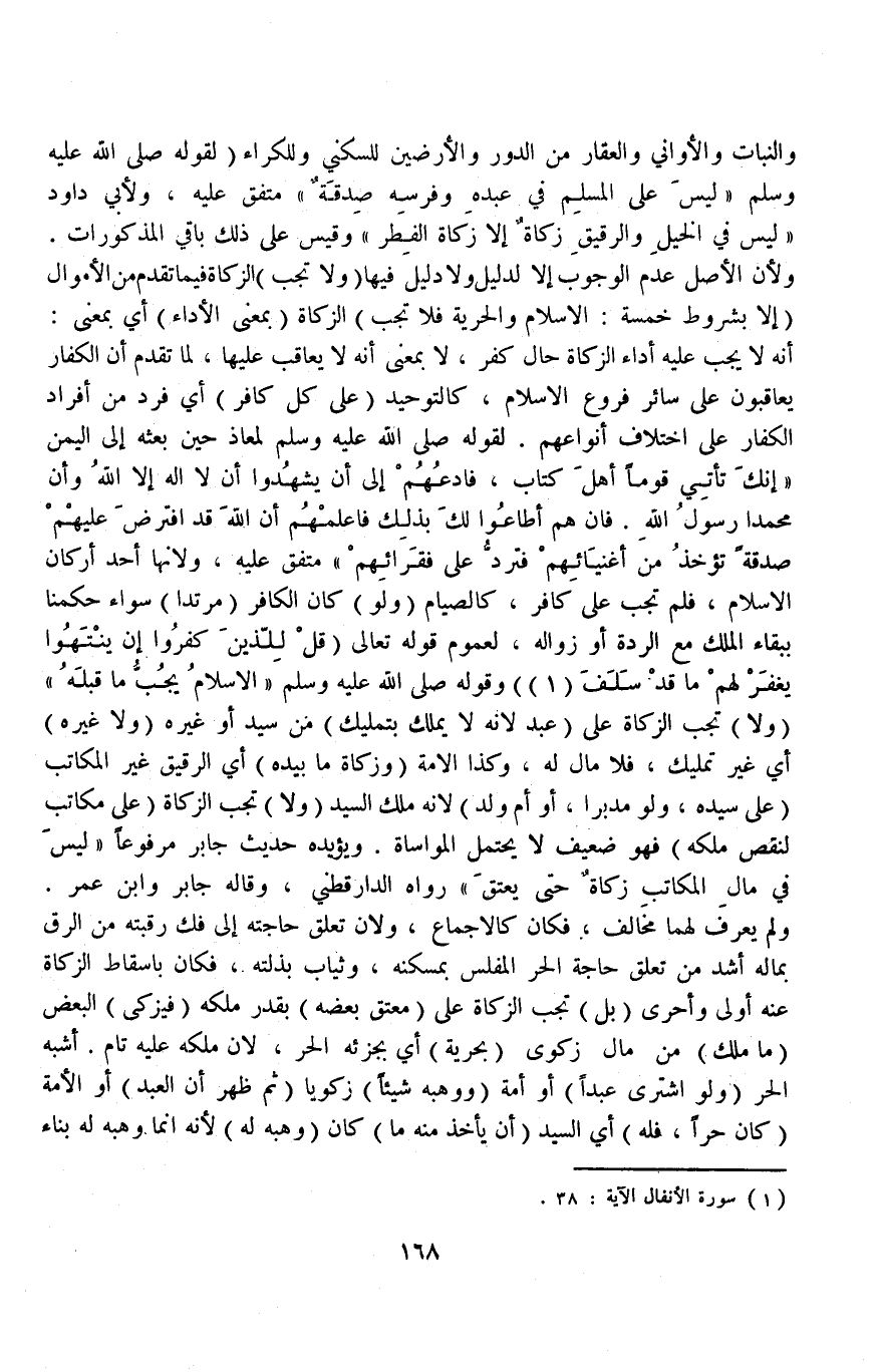(وَلَا تَجِبُ) الزَّكَاةُ فِيمَا تَقَدَّمَ مِنْ الْأَمْوَالِ (إلَّا بِشُرُوطٍ خَمْسَةٍ: الْإِسْلَامُ وَالْحُرِّيَّةُ فَلَا تَجِبُ) الزَّكَاةُ (بِمَعْنَى الْأَدَاءِ) أَيْ: بِمَعْنَى أَنَّهُ لَا يَجِبْ عَلَيْهِ أَدَاءُ الزَّكَاةِ حَالَ كُفْرٍ لَا بِمَعْنَى أَنَّهُ لَا يُعَاقَبُ عَلَيْهَا، لِمَا تَقَدَّمَ أَنَّ الْكُفَّارَ يُعَاقَبُونَ عَلَى سَائِرِ فُرُوعِ الْإِسْلَامِ، كَالتَّوْحِيدِ (عَلَى كُلِّ كَافِرٍ) أَيْ: فَرْدٍ مِنْ أَفْرَادِ الْكُفَّارِ عَلَى اخْتِلَافِ أَنْوَاعِهِمْ لِقَوْلِهِ - صَلَّى اللَّهُ عَلَيْهِ وَسَلَّمَ - لِمُعَاذِ حِينَ بَعَثَهُ إلَى الْيَمَنِ: «إنَّك تَأْتِي قَوْمًا أَهْلَ كِتَابٍ، فَادْعُهُمْ إلَى أَنْ يَشْهَدُوا أَنْ لَا إلَهَ إلَّا اللَّهُ وَأَنَّ مُحَمَّدًا رَسُولُ اللَّهِ فَإِنْ هُمْ أَطَاعُوا لَك بِذَلِكَ فَأَعْلِمْهُمْ أَنَّ اللَّهَ قَدْ افْتَرَضَ عَلَيْهِمْ صَدَقَةً تُؤْخَذُ مِنْ أَغْنِيَائِهِمْ فَتُرَدُّ عَلَى فُقَرَائِهِمْ» مُتَّفَقٌ عَلَيْهِ، وَلِأَنَّهَا أَحَدُ أَرْكَانِ الْإِسْلَامِ، فَلَمْ تَجِبْ عَلَى كَافِرٍ، كَالصِّيَامِ.
