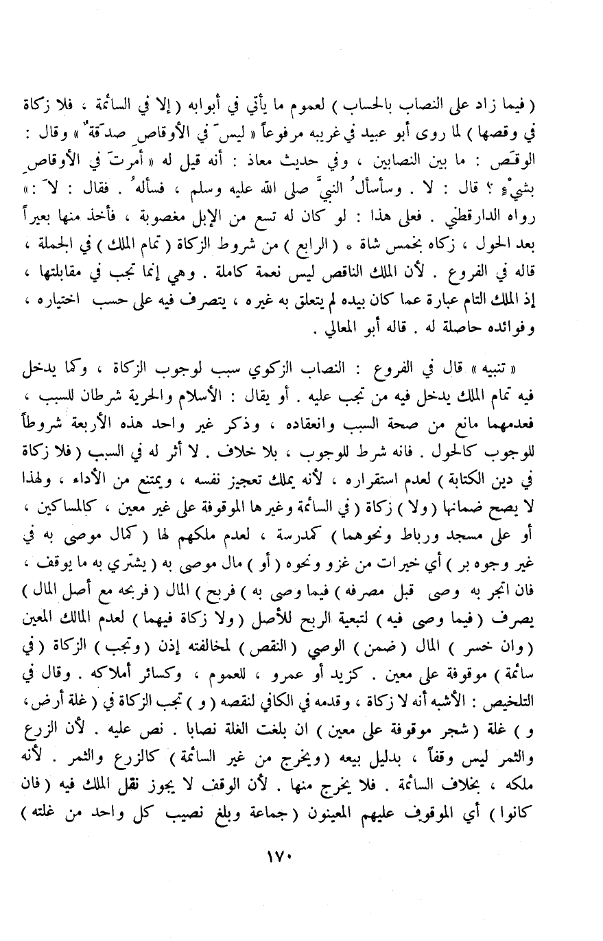 (وَيُخْرِجُ مِنْ غَيْرِ السَّائِمَةِ) كَالزَّرْعِ وَالثَّمَرِ لِأَنَّهُ مِلْكُهُ بِخِلَافِ السَّائِمَةِ فَلَا يُخْرِجُ مِنْهَا لِأَنَّ الْوَقْفَ لَا يَجُوزُ نَقْلُ الْمِلْكِ فِيهِ (فَإِنْ كَانُوا) أَيْ: الْمَوْقُوفُ عَلَيْهِمْ الْمُعَيَّنُونَ (جَمَاعَةً وَبَلَغَ نَصِيبُ كُلِّ وَاحِدٍ مِنْ غَلَّتِهِ)