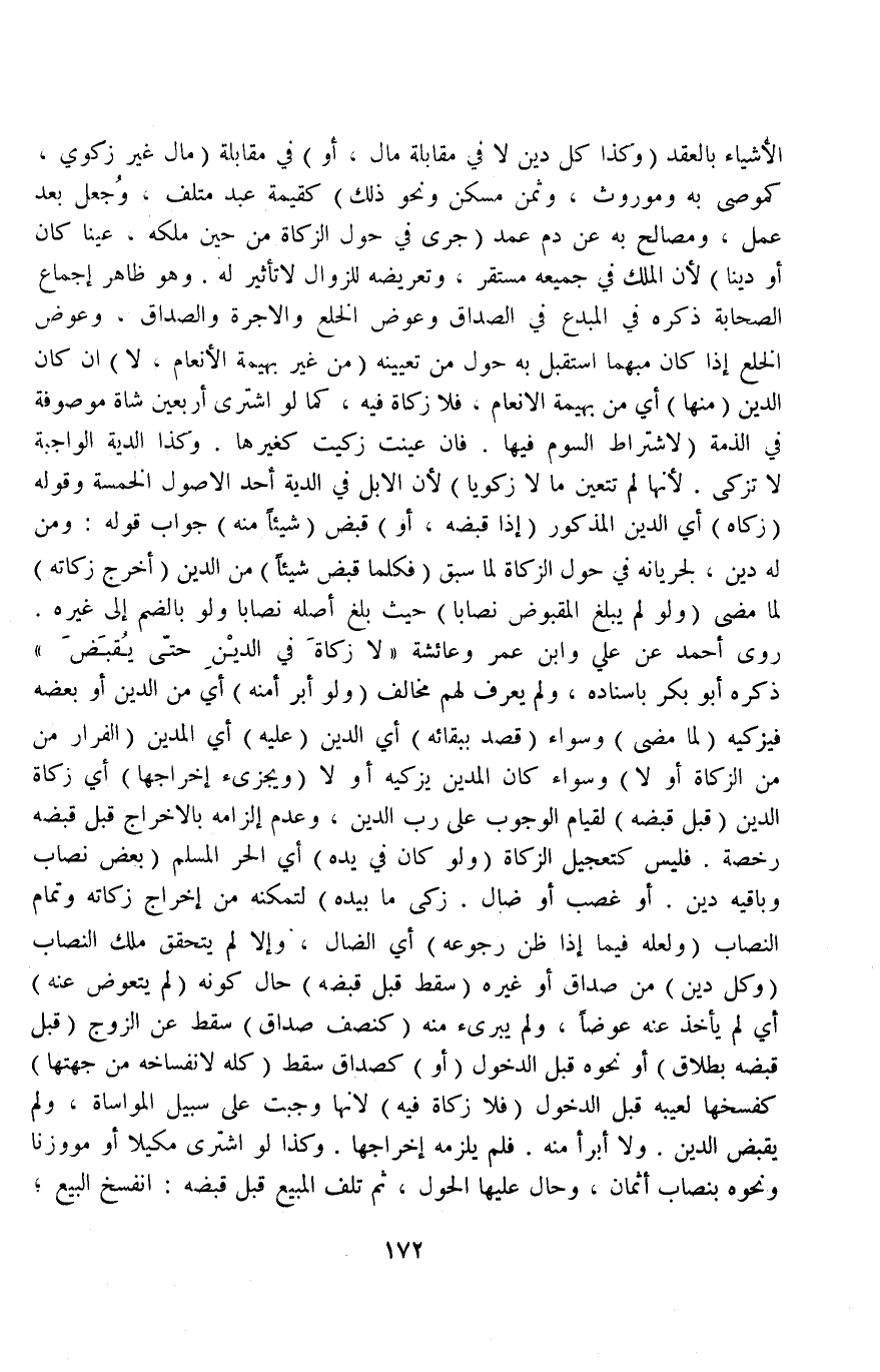 الْأَشْيَاءِ بِالْعَقْدِ (وَكَذَا كُلُّ دَيْنٍ لَا فِي مُقَابَلَةِ مَالٍ، أَوْ) فِي مُقَابَلَةِ (مَالٍ غَيْرِ زَكَوِيٍّ، كَمُوصَى بِهِ وَمَوْرُوثٍ، وَثَمَنِ مَسْكَنٍ وَنَحْوِ ذَلِكَ) كَقِيمَةِ عَبْدٍ مُتْلَفٍ وَجُعْلٍ بَعْدَ عَمَلٍ، وَمُصَالَح بِهِ عَنْ دَمِ عَمْدٍ (جَرَى فِي حَوْلِ الزَّكَاةِ مِنْ حِينِ مِلْكِهِ، عَيْنًا كَانَ أَوْ دَيْنًا) لِأَنَّ الْمِلْكَ فِي جَمِيعِهِ مُسْتَقِرٌّ، وَتَعْرِيضُهُ لِلزَّوَالِ لَا تَأْثِيرَ لَهُ.
