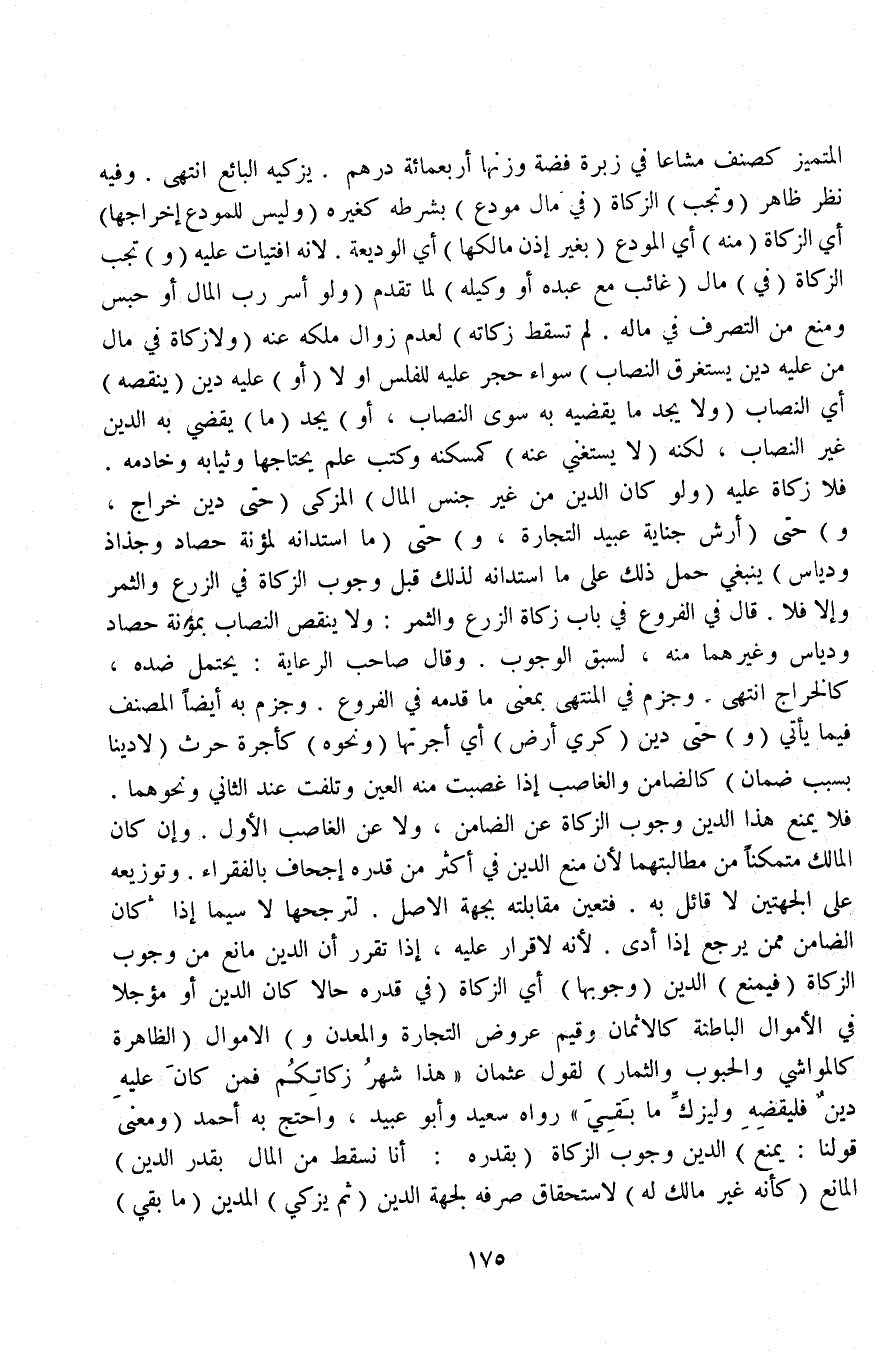 (وَلَا زَكَاةَ فِي مَالِ مَنْ عَلَيْهِ دَيْنٌ يَسْتَغْرِقُ النِّصَابَ) ؟ سَوَاءً حُجِرَ عَلَيْهِ لِلْفَلَسِ أَوْ لَا (أَوْ) عَلَيْهِ دَيْنٌ (يُنْقِصُهُ) أَيْ: النِّصَابَ (وَلَا يَجِدُ مَا يَقْضِيه بِهِ سِوَى النِّصَابِ، أَوْ) يَجِدُ (مَا) يَقْضِي بِهِ الدَّيْنُ غَيْرَ النِّصَابِ، لَكِنَّهُ (لَا يَسْتَغْنِي عَنْهُ) كَمَسْكَنِهِ وَكُتُبِ عِلْمٍ يَحْتَاجُهَا وَثِيَابِهِ وَخَادِمِهِ فَلَا زَكَاةَ عَلَيْهِ (وَلَوْ كَانَ الدَّيْنُ مِنْ غَيْرِ جِنْسِ الْمَالِ) الْمُزَكَّى (حَتَّى دَيْنُ خَرَاجٍ، وَ) حَتَّى (أَرْشُ جِنَايَةِ عَبِيدِ التِّجَارَةِ، وَ) حَتَّى (مَا اسْتَدَانَهُ لِمُؤْنَةِ حَصَادٍ وَجُذَاذٍ وَدِيَاسٍ) يَنْبَغِي حَمْلُ ذَلِكَ عَلَى مَا اسْتَدَانَهُ لِذَلِكَ قَبْلَ وُجُوبِ الزَّكَاةِ فِي الزَّرْعِ وَالثَّمَرِ وَإِلَّا فَلَا قَالَ فِي الْفُرُوعِ فِي بَابِ زَكَاةِ الزَّرْعِ وَالثَّمَرِ: وَلَا يَنْقُصُ النِّصَابُ بِمُؤْنَةِ حَصَادٍ وَدِيَاسٍ وَغَيْرِهِمَا مِنْهُ، لِسَبْقِ الْوُجُوبِ وَقَالَ صَاحِبُ الرِّعَايَةِ: يُحْتَمَلُ ضِدُّهُ، كَالْخَرَاجِ انْتَهَى.
