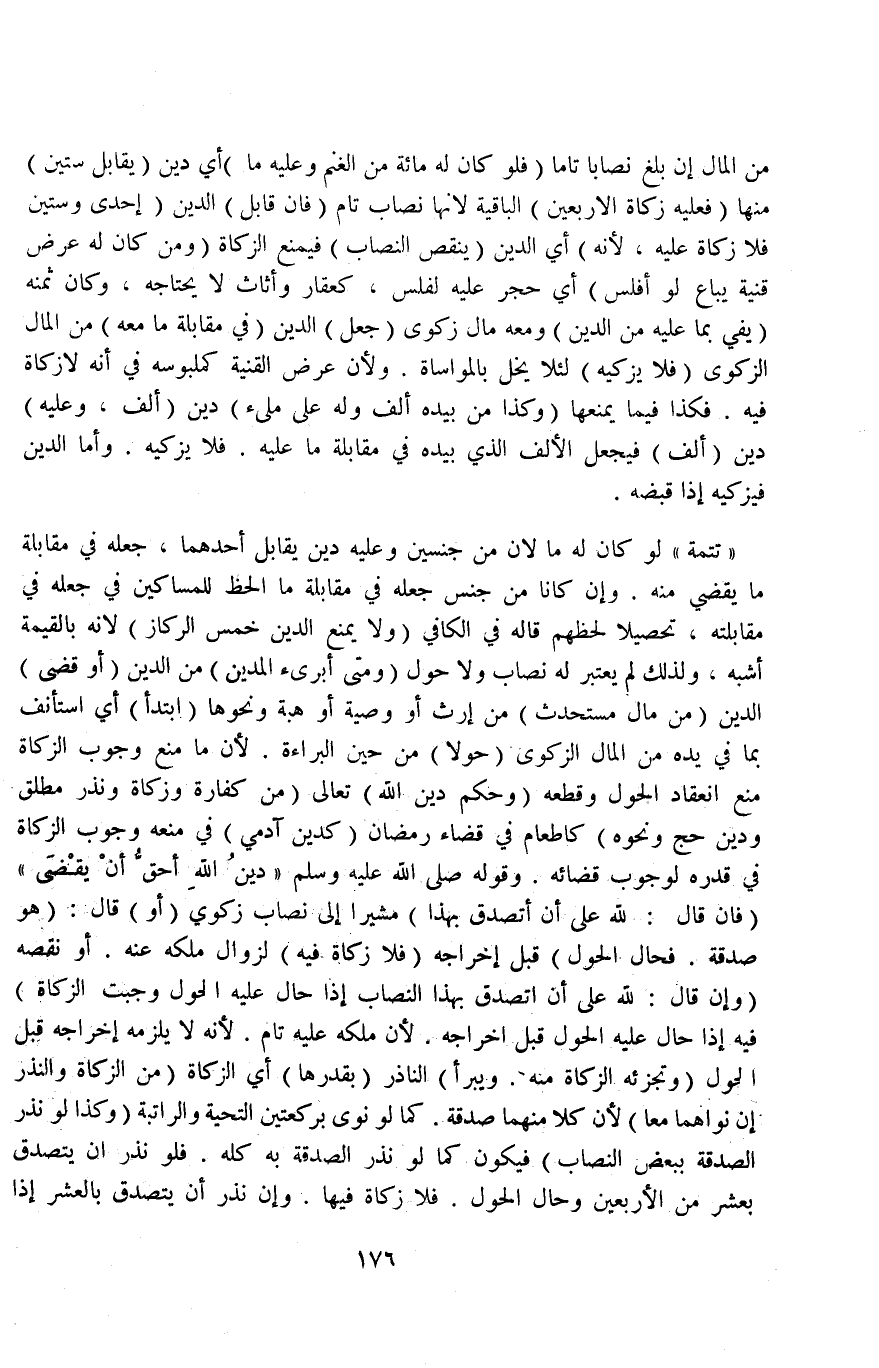 مِنْ الْمَالِ إنْ بَلَغَ نِصَابًا تَامًّا (فَلَوْ كَانَ لَهُ مِائَةٌ مِنْ الْغَنَمِ وَعَلَيْهِ مَا) أَيْ: دَيْنٌ (يُقَابِلُ سِتِّينَ) مِنْهَا (فَعَلَيْهِ زَكَاةُ الْأَرْبَعِينَ) الْبَاقِيَةِ لِأَنَّهَا نِصَابٌ تَامٌّ (فَإِنْ قَابَلَ) الدَّيْنَ (إحْدَى وَسِتِّينَ فَلَا زَكَاةَ عَلَيْهِ لِأَنَّهُ) أَيْ: الدَّيْنَ (يُنْقِصُ النِّصَابَ) فَيَمْنَعُ الزَّكَاةَ.
