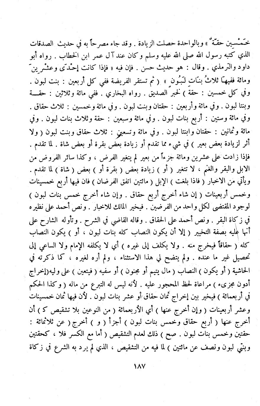 وَقَدْ جَاءَ مُصَرَّحًا بِهِ فِي حَدِيثِ الصَّدَقَاتِ الَّذِي كَتَبَهُ رَسُولُ اللَّهِ - صَلَّى اللَّهُ عَلَيْهِ وَسَلَّمَ - وَكَانَ عِنْدَ آلِ عُمَرَ بْنِ الْخَطَّابِ رَوَاهُ أَبُو دَاوُد وَالتِّرْمِذِيُّ وَقَالَ: هُوَ حَدِيثٌ حَسَنٌ فَإِنَّ فِيهِ «فَإِذَا كَانَتْ إحْدَى وَعِشْرِينَ وَمِائَةً فَفِيهَا ثَلَاثُ بَنَاتِ لَبُونٍ» (ثُمَّ تَسْتَقِرُّ الْفَرِيضَةُ فَفِي كُلِّ أَرْبَعِينَ بِنْتُ لَبُونٍ وَفِي كُلّ خَمْسِينَ حِقَّةٌ) لِخَبَرِ الصِّدِّيقِ رَوَاهُ الْبُخَارِيُّ فَفِي مِائَةٍ وَثَلَاثِينَ حِقَّةٌ وَبِنْتَا لَبُونٍ وَفِي مِائَةٍ وَأَرْبَعِينَ: حِقَّتَانِ وَبِنْتَ لَبُونٍ وَفِي مِائَةٍ وَخَمْسِينَ: ثَلَاثُ حِقَاقٍ وَفِي مِائَةٍ وَسِتِّينَ: أَرْبَعُ بَنَاتِ لَبُونٍ وَفِي مِائَةٍ وَسَبْعِينَ حِقَّةٌ وَثَلَاثُ بَنَاتِ لَبُونٍ وَفِي مِائَةٍ وَثَمَانِينَ: حِقَّتَانِ وَابْنَتَا لَبُونٍ وَفِي مِائَةٍ وَتِسْعِينَ: ثَلَاثُ حِقَاقٍ وَبِنْتُ لَبُونٍ (وَلَا أَثَرَ لِزِيَادَةِ بَعْضِ بَعِيرٍ) فِي شَيْءٍ تَقَدَّمَ أَوْ زِيَادَةِ بَعْضِ بَقَرَةٍ أَوْ بَعْضِ شَاةٍ لِمَا تَقَدَّمَ فَإِذَا زَادَتْ عَلَى عِشْرِينَ وَمِائَةٍ جُزْءًا مِنْ بَعِيرٍ لَمْ يَتَغَيَّرْ الْفَرْضُ، وَكَذَا سَائِرُ الْفُرُوضِ مِنْ الْإِبِلِ وَالْبَقَرِ وَالْغَنَمِ، لَا تَتَغَيَّرُ (أَوْ) زِيَادَةُ بَعْضِ (بَقَرَةٍ أَوْ) بَعْضِ شَاةٍ لِمَا تَقَدَّمَ وَيَأْتِي مِنْ الْأَخْبَارِ.