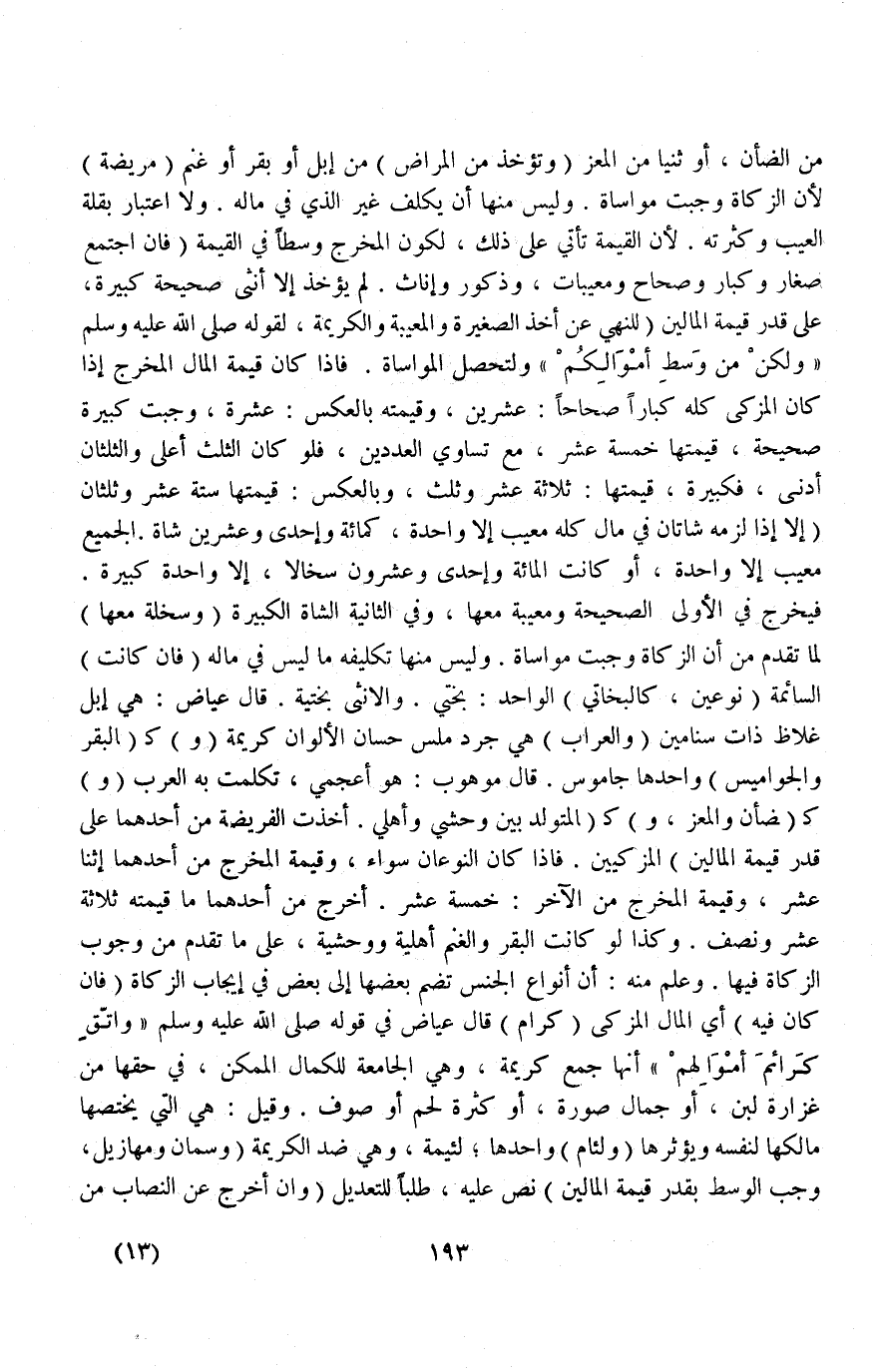 (وَ) ك (ضَأْنٍ وَالْمَعْزِ، وَ) كَ (الْمُتَوَلِّدِ بَيْنَ وَحْشِيٍّ وَأَهْلِيٍّ أُخِذَتْ الْفَرِيضَةُ مِنْ أَحَدِهِمَا عَلَى قَدْرِ قِيمَةِ الْمَالَيْنِ) الْمُزَكَّيَيْنِ فَإِذَا كَانَ النَّوْعَانِ سَوَاء، وَقِيمَةُ الْمُخْرَجِ مِنْ أَحَدِهِمَا اثْنَا عَشْرَ، وَقِيمَةُ الْمُخْرَجِ مِنْ الْآخَرِ خَمْسَةَ عَشَرَ أَخْرَجَ مِنْ أَحَدِهِمَا مَا قِيمَتُهُ ثَلَاثَةَ عَشَرَ وَنِصْفٌ وَكَذَا لَوْ كَانَتْ الْبَقَرُ وَالْغَنَمُ أَهْلِيَّةٌ وَوَحْشِيَّةٌ عَلَى مَا تَقَدَّمَ مِنْ وُجُوبِ الزَّكَاةِ فِيهَا وَعُلِمَ مِنْهُ: أَنَّ أَنْوَاعَ الْجِنْسِ تُضَمُّ بَعْضُهَا إلَى بَعْضٍ فِي إيجَابِ الزَّكَاةِ (فَإِنْ كَانَ فِيهِ) أَيْ: الْمَالِ الْمُزَكَّى (كِرَامٌ) قَالَ عِيَاضٌ فِي قَوْلِهِ: - صَلَّى اللَّهُ عَلَيْهِ وَسَلَّمَ - «وَاتَّقِ كَرَائِمَ أَمْوَالِهِمْ» أَنَّهَا جَمْعُ كَرِيمَةٍ، وَهِيَ الْجَامِعَةُ لِلْكَمَالِ الْمُمْكِنِ، فِي حَقِّهَا مِنْ غَزَارَةِ لَبَنٍ، أَوْ جَمَالِ صُورَةٍ، أَوْ كَثْرَةِ لَحْمٍ أَوْ صُوفٍ وَقِيلَ: هِيَ الَّتِي يَخْتَصُّهَا مَالِكُهَا لِنَفْسِهِ وَيُؤْثِرُهَا (وَلِئَامُ) وَاحِدُهَا؛ لَئِيمَةٌ، وَهِيَ ضِدُّ الْكَرِيمَةِ (وَسِمَانٌ وَمَهَازِيلُ، وَجَبَ الْوَسَطُ بِقَدْرِ قِيمَةِ الْمَالَيْنِ) نَصَّ عَلَيْهِ، طَلَبًا لِلتَّعْدِيلِ.