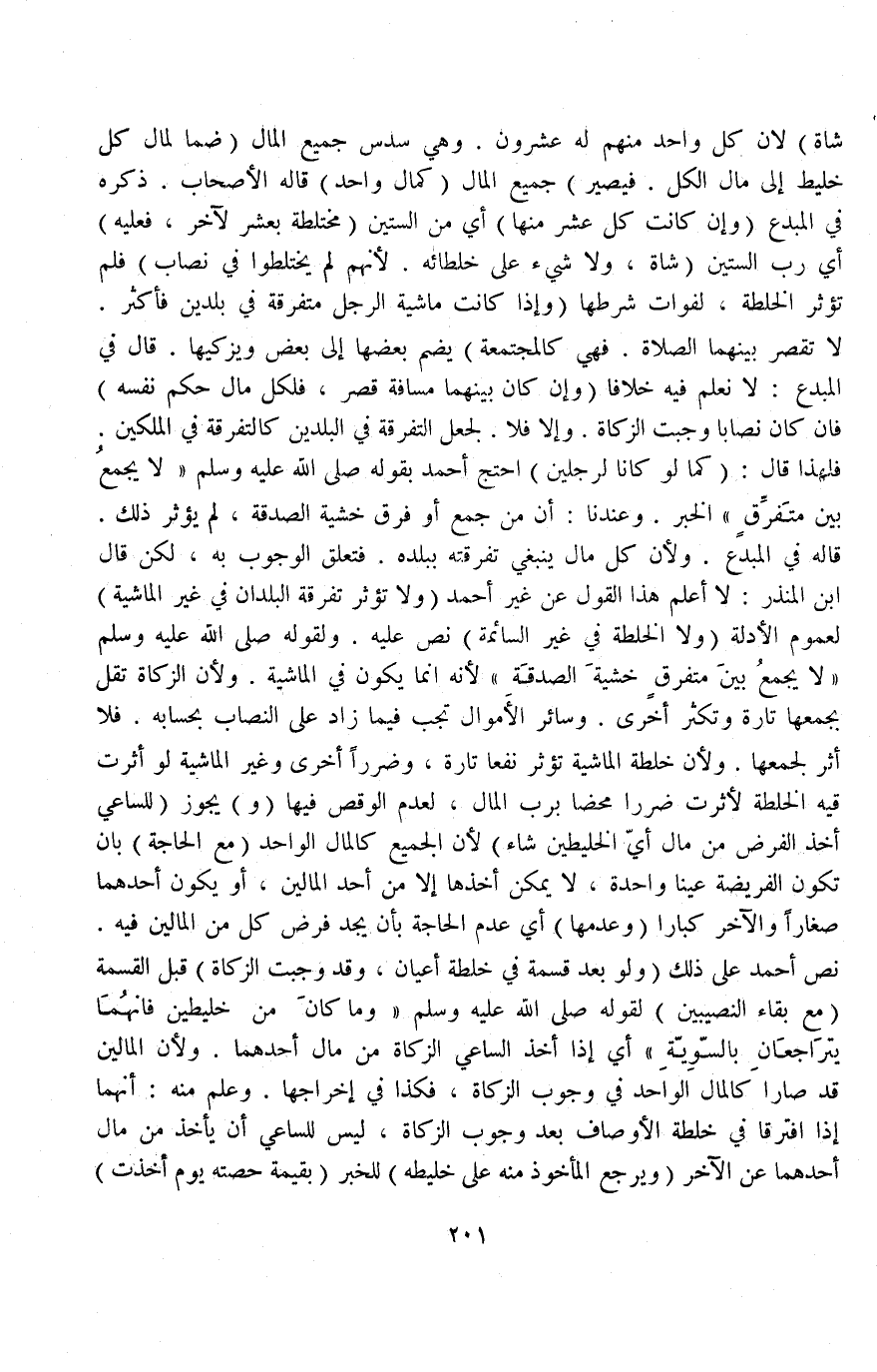 شَاةٍ) لِأَنَّ كُلَّ وَاحِدٍ مِنْهُمْ لَهُ عِشْرُونَ وَهِيَ سُدُسُ جَمِيعِ الْمَالِ (ضَمًّا لِمَالِ كُلِّ خَلِيطٍ إلَى مَالِ الْكُلِّ فَيَصِيرُ) جَمِيعُ الْمَالِ (كَمَالٍ وَاحِدٍ) قَالَهُ الْأَصْحَابُ ذَكَرَهُ فِي الْمُبْدِعِ (وَإِنْ كَانَتْ كُلُّ عَشْرٍ مِنْهَا) أَيْ مِنْ السِّتِّينَ (مُخْتَلِطَةً بِعَشْرٍ لِآخَرَ، فَعَلَيْهِ) أَيْ رَبِّ السِّتِّينَ (شَاةٌ، وَلَا شَيْءَ عَلَى خُلَطَائِهِ لِأَنَّهُمْ لَمْ يَخْتَلِطُوا فِي نِصَابٍ) فَلَمْ تُؤَثِّر الْخُلْطَةُ، لِفَوَاتِ شَرْطِهَا.