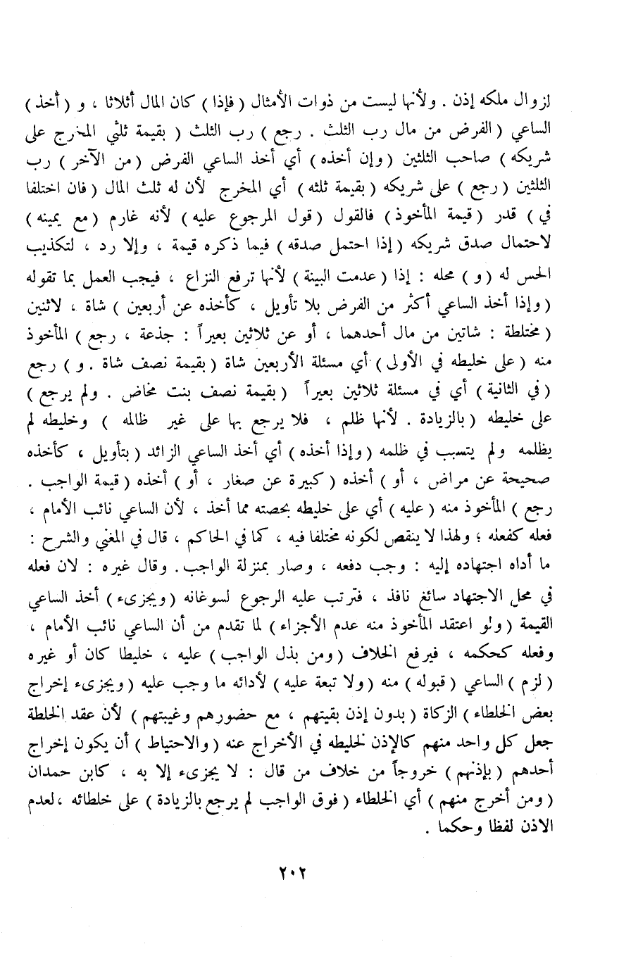 (وَإِذَا أَخَذَ السَّاعِي أَكْثَرَ مِنْ الْفَرْضِ بِلَا تَأْوِيلٍ، كَأَخْذِهِ عَنْ أَرْبَعِينَ) شَاةً، لِاثْنَيْنِ (مُخْتَلِطَةٍ: شَاتَيْنِ مِنْ مَالِ أَحَدِهِمَا، أَوْ عَنْ ثَلَاثِينَ بَعِيرًا: جَذَعَةً، رَجَعَ) الْمَأْخُوذُ مِنْهُ (عَلَى خَلِيطِهِ فِي الْأُولَى) أَيْ مَسْأَلَةِ الْأَرْبَعِينَ شَاةً (بِقِيمَةِ نِصْفِ شَاةٍ وَ) رَجَعَ (فِي الثَّانِيَة) أَيْ فِي مَسْأَلَةِ ثَلَاثِينَ بَعِيرًا (بِقِيمَةِ نِصْفِ بِنْتِ مَخَاضٍ وَلَمْ يَرْجِعْ) عَلَى خَلِيطِهِ (بِالزِّيَادَةِ لِأَنَّهَا ظُلْمٍ، فَلَا يَرْجِعُ بِهَا عَلَى غَيْرِ ظَالِمِهِ) وَخَلِيطُهُ لَمْ يَظْلِمْهُ وَلَمْ يَتَسَبَّبْ فِي ظُلْمِهِ.