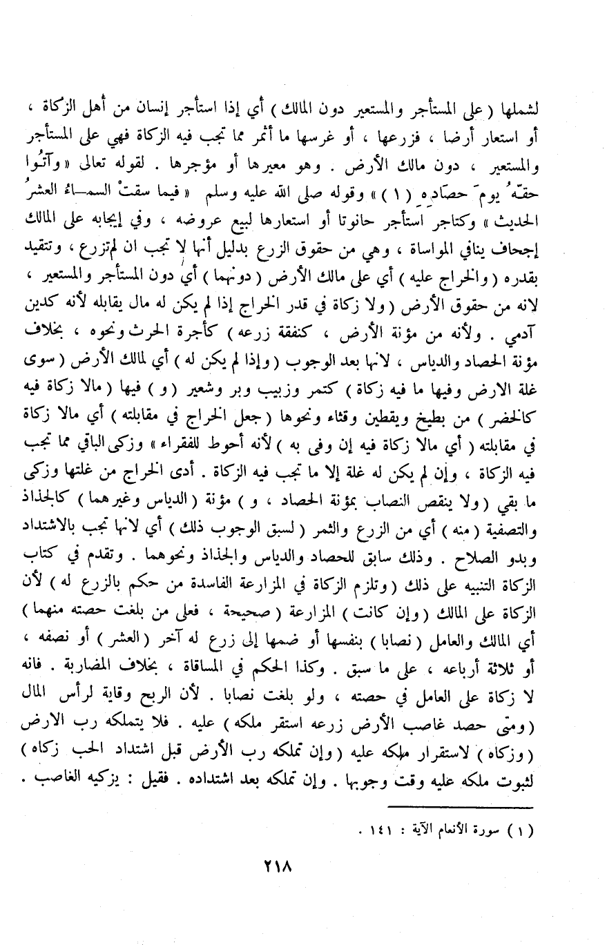 لِشَمْلِهَا (عَلَى الْمُسْتَأْجِرِ وَالْمُسْتَعِير دُونَ الْمَالِكِ) أَيْ إذَا اسْتَأْجَرَ إنْسَانٌ مِنْ أَهْلِ الزَّكَاةِ أَوْ اسْتَعَارَ أَرْضًا فَزَرَعَهَا أَوْ غَرَسَهَا مَا أَثْمَرَ مِمَّا تَجِبُ فِيهِ الزَّكَاةُ فَهِيَ عَلَى الْمُسْتَأْجِرِ وَالْمُسْتَعِيرِ دُونَ مَالِك الْأَرْضِ وَهُوَ مُعِيرُهَا أَوْ مُؤَجِّرُهَا لِقَوْلِهِ تَعَالَى {وَآتُوا حَقَّهُ يَوْمَ حَصَادِهِ} [الأنعام: ١٤١] وَقَوْلُهُ - صَلَّى اللَّهُ عَلَيْهِ وَسَلَّمَ - «فِيمَا سَقَتْ السَّمَاءُ الْعُشْرُ» الْحَدِيثُ وَكَتَاجِرٍ اسْتَأْجَرَ حَانُوتًا أَوْ اسْتَعَارَهَا لِبَيْعِ عُرُوضِهِ وَفِي إيجَابِهِ عَلَى الْمَالِكِ إجْحَافٌ يُنَافِي الْمُوَاسَاةَ وَهِيَ مِنْ حُقُوقِ الزَّرْعِ بِدَلِيلِ أَنَّهَا لَا تَجِبُ إنْ لَمْ تُزْرَعْ وَتَتَقَيَّدُ بِقَدْرِهِ.