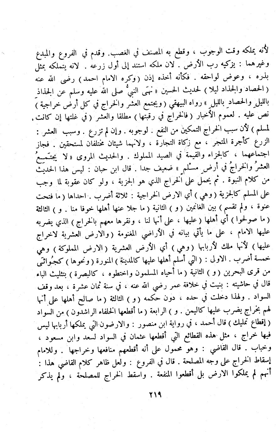 (وَيَجْتَمِعُ الْعُشْرُ وَالْخَرَاجُ فِي كُلِّ أَرْضٍ خَرَاجِيَّةٍ) نَصَّ عَلَيْهِ لِعُمُومِ الْأَخْبَارِ (فَالْخَرَاجُ فِي رَقَبَتِهَا) مُطْلَقًا وَالْعُشْرُ (فِي غَلَّتِهَا إنْ كَانَتْ لِمُسْلِمٍ) لِأَنَّ سَبَبَ الْخَرَاجِ التَّمْكِينُ مِنْ النَّفْعِ لِوُجُوبِهِ وَإِنْ لَمْ تُزْرَعْ وَسَبَبُ الْعُشْرِ: الزَّرْعُ كَأُجْرَةِ الْمَتْجَرِ مَعَ زَكَاةِ التِّجَارَةِ وَلِأَنَّهُمَا شَيْئَانِ مُخْتَلِفَانِ لِمُسْتَحَقِّينَ فَجَازَ اجْتِمَاعُهُمَا كَالْجَزَاءِ وَالْقِيمَةِ فِي الصَّيْدِ الْمَمْلُوكِ وَالْحَدِيثُ الْمَرْوِيُّ «لَا يَجْتَمِعُ الْعُشْرُ وَالْخَرَاجُ فِي أَرْضِ مُسْلِمٍ» ضَعِيفٌ جِدًّا قَالَ ابْنُ حِبَّانَ: لَيْسَ هَذَا الْحَدِيثُ مِنْ كَلَامِ النُّبُوَّةِ ثُمَّ يُحْمَلُ عَلَى الْخَرَاجِ الَّذِي هُوَ الْجِزْيَةُ وَلَوْ كَانَ عُقُوبَةً لَمَا وَجَبَ عَلَى الْمُسْلِمِ كَالْجِزْيَةِ (وَهِيَ) أَيْ الْأَرْضُ الْخَرَاجِيَّةُ ثَلَاثَةُ أَضْرُبٍ إحْدَاهَا (مَا فُتِحَتْ عَنْوَةً وَلَمْ تُقْسَمْ) بَيْنَ الْغَانِمِينَ.