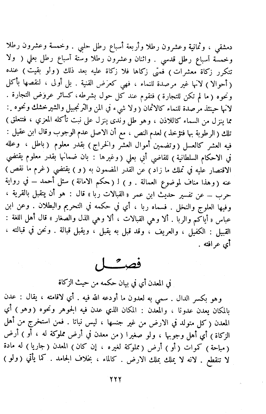 فَصْلٌ فِي الْمَعْدِنِ أَيْ فِي بَيَانِ حُكْمِهِ مِنْ حَيْثُ الزَّكَاةُ وَهُوَ بِكَسْرِ الدَّالِ سُمِّيَ بِهِ لِعُدُونِ مَا أَوْدَعَهُ اللَّهُ فِيهِ أَيْ لِإِقَامَتِهِ يُقَالُ عَدَنَ بِالْمَكَانِ يَعْدِنُ عُدُونًا وَالْمَعْدِنُ: الْمَكَانُ الَّذِي عُدِنَ فِيهِ الْجَوْهَرُ وَنَحْوُهُ (وَهُوَ) أَيْ الْمَعْدِنُ (كُلُّ مُتَوَلِّدٍ فِي الْأَرْضِ مِنْ غَيْرِ جِنْسِهَا لَيْسَ نَبَاتًا فَمَنْ اسْتَخْرَجَ مِنْ أَهْلِ الزَّكَاةِ) أَيْ أَهْلِ وُجُوبِهَا وَلَوْ صَغِيرًا مِنْ مَعْدِنٍ فِي أَرْضٍ مَمْلُوكَةٍ لَهُ أَوْ أَرْضٍ (مُبَاحَةٍ) كَمَوَاتٍ (أَوْ) أَرْضٍ (مَمْلُوكَةٍ لِغَيْرِهِ إنْ كَانَ) الْمَعْدِنُ (جَارِيًا) لَهُ مَادَّةٌ لَا تَنْقَطِعُ لِأَنَّهُ لَا يُمْلَكُ بِمِلْكِ الْأَرْضِ كَالْمَاءِ بِخِلَافِ الْجَامِدِ كَمَا يَأْتِي.