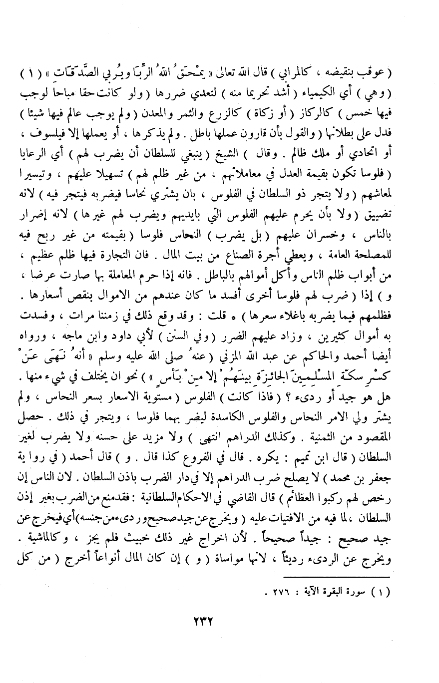 الشَّيْخُ (يَنْبَغِي لِلسُّلْطَانِ أَنْ يَضْرِبَ لَهُمْ) أَيْ الرَّعَايَا (فُلُوسًا تَكُونُ بِقِيمَةِ الْعَدْلِ فِي مُعَامَلَاتِهِمْ مِنْ غَيْرِ ظُلْمٍ لَهُمْ) تَسْهِيلًا عَلَيْهِمْ، وَتَيْسِيرًا لِمَعَاشِهِمْ (وَلَا يَتَّجِرُ ذُو السُّلْطَانِ فِي الْفُلُوسِ، بِأَنْ يَشْتَرِيَ نُحَاسًا فَيَضْرِبَهُ فَيَتَّجِرَ فِيهِ) لِأَنَّهُ تَضْيِيقٌ.