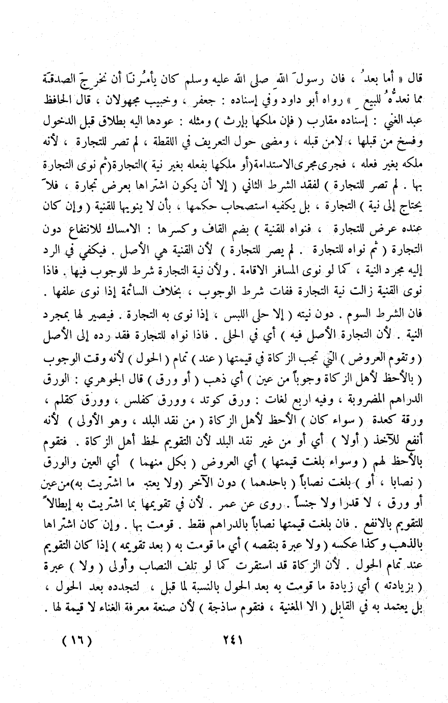 قَالَ أَمَّا بَعْدُ، فَإِنَّ «رَسُولَ اللَّهِ - صَلَّى اللَّهُ عَلَيْهِ وَسَلَّمَ - كَانَ يَأْمُرُنَا أَنْ نُخْرِجَ الصَّدَقَةَ مِمَّا نَعُدُّهُ لِلْبَيْعِ» رَوَاهُ أَبُو دَاوُد وَفِي إسْنَادِهِ جَعْفَرٌ وَخُبَيْبٌ مَجْهُولَانِ قَالَ الْحَافِظُ عَبْدُ الْغَنِيِّ: إسْنَادُهُ مُقَارِبٌ (فَإِنْ مَلَكَهَا بِإِرْثٍ) وَمِثْلِهِ: عَوْدُهَا إلَيْهِ بِطَلَاقٍ قَبْلَ الدُّخُولِ وَفَسَخَ مِنْ قِبَلِهَا، لَا مِنْ قِبَلِهِ، وَمَضَى حَوْلَ التَّعْرِيفِ فِي اللُّقْطَةِ، لَمْ تَصِرْ لِلتِّجَارَةِ لِأَنَّهُ مَلَكَهُ بِغَيْرِ فِعْلِهِ، فَجَرَى مَجْرَى الِاسْتِدَامَةِ (أَوْ مِلْكًا بِفِعْلِهِ بِغَيْرِ نِيَّةِ) التِّجَارَةِ (ثُمَّ نَوَى التِّجَارَةَ بِهَا لَمْ تَصِرْ لِلتِّجَارَةِ) لِفَقْدِ الشَّرْطِ الثَّانِي (إلَّا أَنْ يَكُونَ اشْتَرَاهَا بِعَرْضِ تِجَارَةٍ، فَلَا يَحْتَاجُ إلَى نِيَّةِ) التِّجَارَةِ، بَلْ يَكْفِيهِ اسْتِصْحَابُ حُكْمِهَا، بِأَنْ لَا يَنْوِيَهَا لِلْقِنْيَةِ.