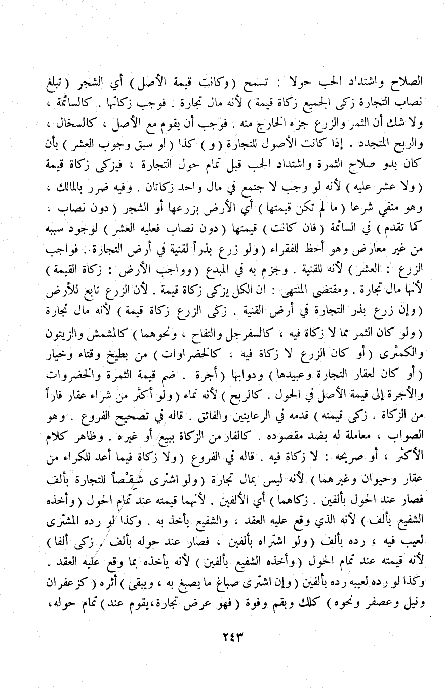 (وَ) كَذَا (لَوْ سَبَقَ وُجُوبُ الْعُشْرِ) بِأَنْ كَانَ بُدُوُّ صَلَاحِ الثَّمَرَةِ وَاشْتِدَادِ الْحَبِّ قَبْلَ تَمَامِ حَوْلِ التِّجَارَةِ فَيُزَكِّي زَكَاةَ قِيمَةٍ (وَلَا عُشْرَ عَلَيْهِ) لِأَنَّهُ لَوْ وَجَبَ لَاجْتَمَعَ فِي مَالٍ وَاحِدٍ زَكَاتَانِ وَفِيهِ ضَرَرٌ بِالْمَالِكِ، وَهُوَ مَنْفِيٌّ شَرْعًا (مَا لَمْ تَكُنْ قِيمَتُهَا) أَيْ الْأَرْضِ بِزَرْعِهَا أَوْ الشَّجَرِ (دُونَ نِصَابٍ كَمَا تَقَدَّمَ) فِي السَّائِمَةِ (فَإِنْ كَانَتْ) قِيمَتُهَا (دُونَ نِصَابٍ فَعَلَيْهِ الْعُشْرُ) لِوُجُودِ سَبَبِهِ مِنْ غَيْرِ مُعَارِضٍ وَهُوَ أَحَظُّ لِلْفُقَرَاءِ.