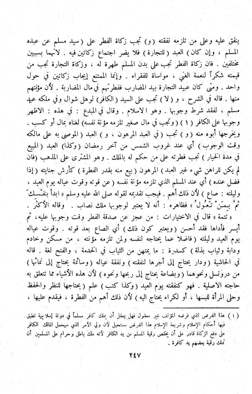(وَ) تَجِبُ زَكَاةُ الْفِطْرِ عَلَى (سَيِّدٍ مُسْلِمٍ عَنْ عَبْدِهِ الْمُسْلِمِ، وَإِنْ كَانَ) الْعَبْدُ (لِلتِّجَارَةِ) فَلَا يَضُرُّ اجْتِمَاعُ زَكَاتَيْنِ فِيهِ لِأَنَّهُمَا بِسَبَبَيْنِ مُخْتَلِفِينَ فَإِنَّ زَكَاةَ الْفِطْرِ تَجِبُ عَلَى بَدَنِ الْمُسْلِمِ طُهْرَةً لَهُ، وَزَكَاةُ التِّجَارَةِ تَجِبُ مِنْ قِيمَتِهِ شُكْرًا لِنِعْمَةِ الْغِنَى، مُوَاسَاةً لِلْفُقَرَاءِ وَإِنَّمَا الْمُمْتَنِعُ إيجَابُ زَكَاتَيْنِ فِي حَوْلٍ وَاحِدٍ وَمَتَى كَانَ عَبِيدُ التِّجَارَةِ بِيَدِ الْمُضَارِبِ فَفِطْرَتُهُمْ فِي مَالِ الْمُضَارَبَةِ لِأَنَّ مُؤْنَتَهُمْ مِنْهَا قَالَهُ فِي الشَّرْحِ، وَ (لَا) تَجِبُ عَلَى السَّيِّدِ (الْكَافِرِ) لَوْ هَلَّ شَوَّالٌ وَفِي مِلْكِهِ عَبْدٌ مُسْلِمٌ، لِفَقْدِ شَرْطِ وُجُوبِهَا وَهُوَ الْإِسْلَامُ وَقَالَ فِي الْمُبْدِعِ فِي هَذِهِ: الْأَظْهَرُ وُجُوبُهَا عَلَى الْكَافِرِ.