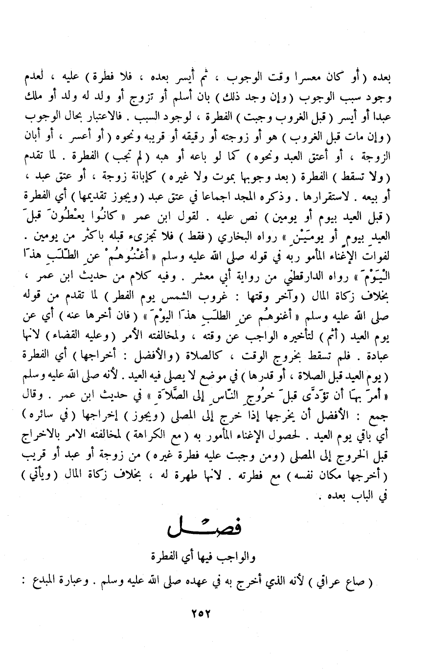 فَصْلٌ وَالْوَاجِبُ فِيهَا أَيْ الْفِطْرَةِ صَاعٌ عِرَاقِيٌّ لِأَنَّهُ الَّذِي أَخْرَجَ بِهِ فِي عَهْدِهِ - صَلَّى اللَّهُ عَلَيْهِ وَسَلَّمَ - وَعِبَارَةُ الْمُبْدِعِ