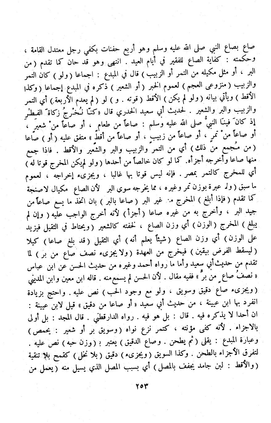 صَاعٌ بِصَاعِ النَّبِيِّ - صَلَّى اللَّهُ عَلَيْهِ وَسَلَّمَ - وَهُوَ أَرْبَعُ حَفَنَاتٍ بِكَفَّيْ رَجُلٍ مُعْتَدِلِ الْقَامَةِ، وَحِكْمَتُهُ: كِفَايَةُ الصَّاعِ لِلْفَقِيرِ فِي أَيَّامِ الْعِيدِ انْتَهَى وَهُوَ قَدْ حَانَ كَمَا تَقَدَّمَ مِنْ الْبُرِّ، أَوْ مِثْلِ مَكِيلِهِ مِنْ التَّمْرِ أَوْ الزَّبِيبِ قَالَ فِي الْمُبْدِعِ إجْمَاعًا.