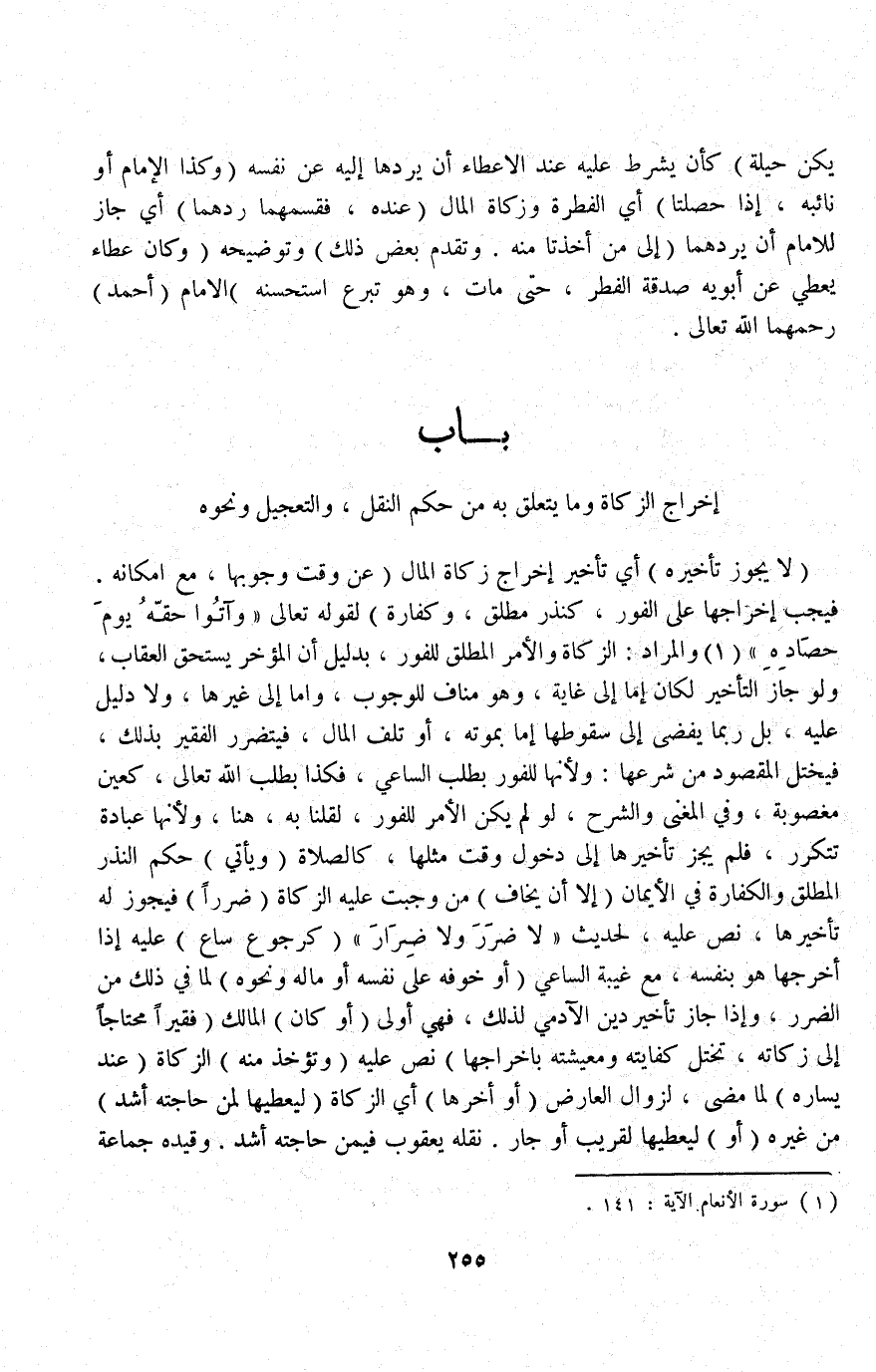 ِ (لَا يَجُوزُ تَأْخِيرُهُ) أَيْ تَأْخِيرُ إخْرَاجِ زَكَاةِ الْمَالِ (عَنْ وَقْتِ وُجُوبِهَا، مَعَ إمْكَانِهِ فَيَجِبُ إخْرَاجُهَا عَلَى الْفَوْرِ، كَنَذْرٍ مُطْلَقٍ، وَكَفَّارَةٍ) لِقَوْلِهِ تَعَالَى {وَآتُوا حَقَّهُ يَوْمَ حَصَادِهِ} [الأنعام: ١٤١] وَالْمُرَادُ: الزَّكَاةُ وَالْأَمْرُ الْمُطْلَقُ لِلْفَوْرِ، بِدَلِيلِ أَنَّ الْمُؤَخِّرَ يَسْتَحِقُّ الْعِقَابَ، وَلَوْ جَازَ التَّأْخِيرُ لَكَانَ إمَّا إلَى غَايَةٍ، وَهُوَ مُنَافٍ لِلْوُجُوبِ، وَإِمَّا إلَى غَيْرِهَا، وَلَا دَلِيلَ عَلَيْهِ، بَلْ رُبَّمَا يُفْضِي إلَى سُقُوطِهَا إمَّا بِمَوْتِهِ، أَوْ تَلَفِ الْمَالِ، فَيَتَضَرَّرُ الْفَقِيرُ بِذَلِكَ، فَيَخْتَلُّ الْمَقْصُودُ مِنْ شَرْعِهَا: وَلِأَنَّهَا لِلْفَوْرِ بِطَلَبِ السَّاعِي، فَكَذَا بِطَلَبِ اللَّهِ تَعَالَى كَعَيْنٍ مَغْصُوبَةٍ.