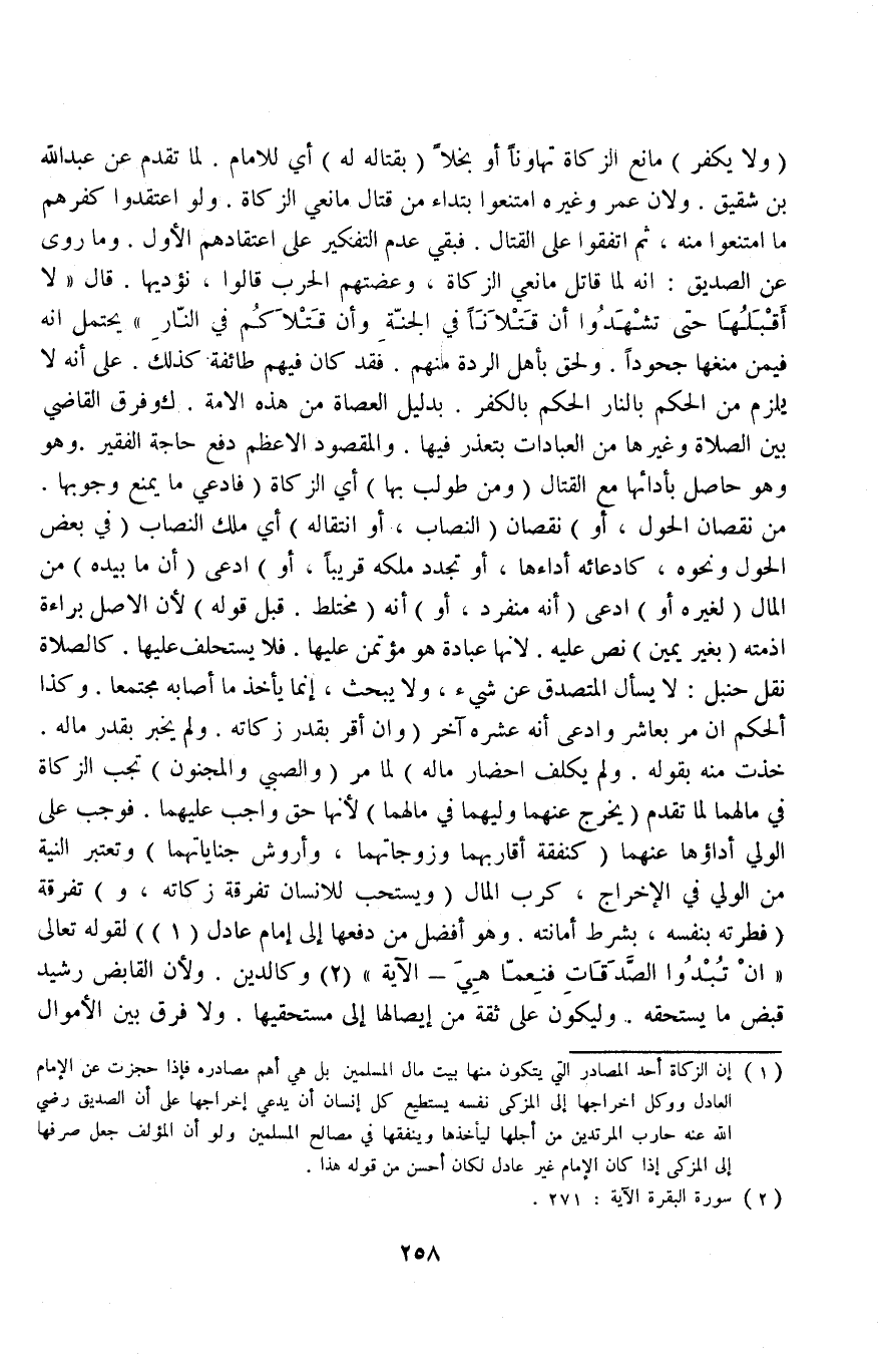 وَلِأَنَّ عُمَرَ وَغَيْرَهُ امْتَنَعُوا ابْتِدَاءً مِنْ قِتَالِ مَانِعِي الزَّكَاةِ وَلَوْ اعْتَقَدُوا كُفْرَهُمْ مَا امْتَنَعُوا مِنْهُ، ثُمَّ اتَّفَقُوا عَلَى الْقِتَالِ فَبَقِيَ عَدَمُ التَّكْفِيرِ عَلَى اعْتِقَادِهِمْ الْأَوَّلِ، وَمَا رُوِيَ عَنْ الصِّدِّيقِ أَنَّهُ لَمَّا قَاتَلَ مَانِعِي الزَّكَاةِ وَعَضَّتْهُمْ الْحَرْبُ قَالُوا، نُؤَدِّيهَا قَالَ " لَا أَقْبَلُهَا حَتَّى تَشْهَدُوا أَنَّ قَتْلَانَا فِي الْجَنَّةِ وَأَنَّ قَتْلَاكُمْ فِي النَّارِ " يُحْتَمَلُ أَنَّهُ فِيمَنْ مَنَعَهَا جُحُودًا وَلَحِقَ بِأَهْلِ الرِّدَّةِ مِنْهُمْ فَقَدْ كَانَ فِيهِمْ طَائِفَةٌ كَذَلِكَ عَلَى أَنَّهُ لَا يَلْزَمُ مِنْ الْحُكْمِ بِالنَّارِ الْحُكْمُ بِالْكُفْرِ، بِدَلِيلِ الْعُصَاةِ مِنْ هَذِهِ الْأُمَّةِ لَوْ فَرَّقَ الْقَاضِي بَيْنَ الصَّلَاةِ وَغَيْرِهَا مِنْ الْعِبَادَاتِ بِتَعَذُّرٍ فِيهَا وَالْمَقْصُودُ الْأَعْظَمُ دَفْعُ حَاجَةِ الْفَقِيرِ وَهُوَ حَاصِلٌ بِأَدَائِهَا مَعَ الْقِتَالِ.