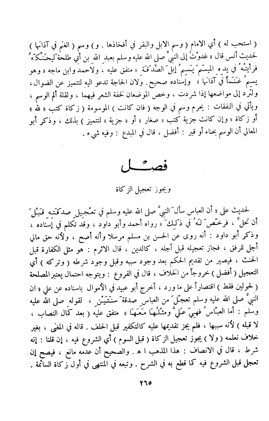 (فَصْل وَيَجُوزُ تَعْجِيلُ الزَّكَاةِ) لِحَدِيثِ عَلِيٍّ «أَنَّ الْعَبَّاسَ سَأَلَ النَّبِيَّ - صَلَّى اللَّهُ عَلَيْهِ وَسَلَّمَ - فِي تَعْجِيلِ صَدَقَتِهِ قَبْلَ أَنْ تَحِلَّ، فَرَخَّصَ لَهُ فِي ذَلِكَ» رَوَاهُ أَحْمَدُ وَأَبُو دَاوُد، وَقَدْ تَكَلَّمَ فِي إسْنَادِهِ، وَذَكَرَ أَبُو دَاوُد أَنَّهُ رُوِيَ عَنْ الْحَسَنِ بْنِ مُسْلِمٍ مُرْسَلًا وَأَنَّهُ أَصَحُّ، وَلِأَنَّهُ حَقٌّ مَالِيٌّ أُجِّلَ لِلرِّفْقِ، فَجَازَ تَعْجِيلُهُ قَبْلَ أَجَلِهِ، كَالدَّيْنِ قَالَ الْأَثْرَمُ: هُوَ مِثْلُ الْكَفَّارَةِ قَبْلَ الْحِنْثِ فَيَصِيرُ مِنْ تَقْدِيمِ الْحُكْمِ بَعْدَ وُجُودِ سَبَبِهِ وَقَبْلَ وُجُودِ شَرْطِهِ.