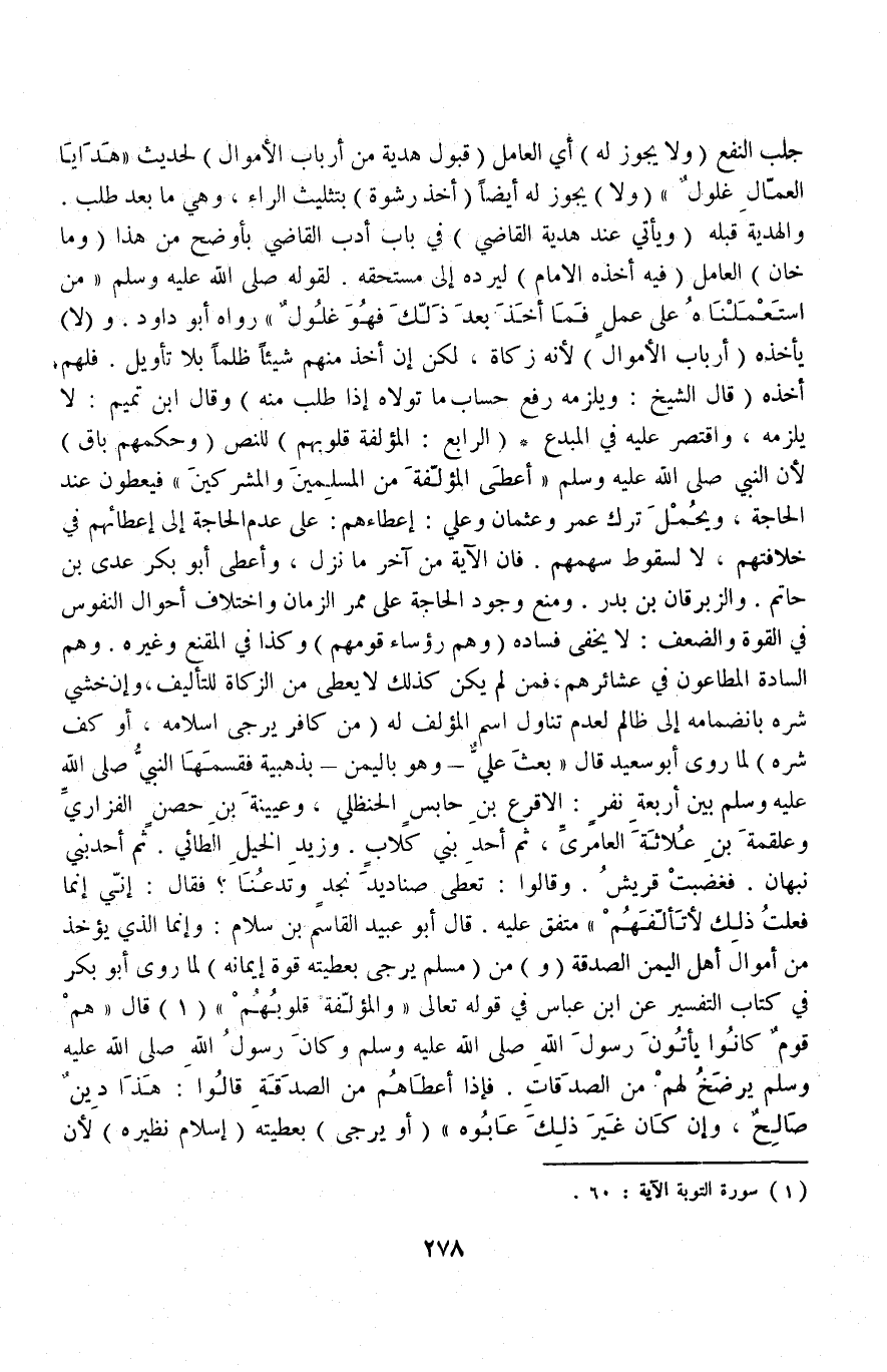 (وَهُمْ رُؤَسَاءُ قَوْمِهِمْ) وَكَذَا فِي الْمُقْنِعِ وَغَيْرِهِ وَهُمْ السَّادَةُ الْمُطَاعُونَ فِي عَشَائِرِهِمْ، فَمَنْ لَمْ يَكُنْ كَذَلِكَ لَا يُعْطَى مِنْ الزَّكَاةِ لِلتَّأْلِيفِ، وَإِنْ خَشِيَ شَرَّهُ بِانْضِمَامِهِ إلَى ظَالِمٍ؛ لِعَدَمِ تُنَاوِل اسْمِ الْمُؤَلَّفِ لَهُ (مِنْ كَافِرٍ يُرْجَى إسْلَامُهُ، أَوْ كَفُّ شَرِّهِ) لِمَا رَوَى أَبُو سَعِيدٍ قَالَ «بَعَثَ عَلِيٌّ وَهُوَ بِالْيَمَنِ بِذَهَبِيَّةٍ فَقَسَّمَهَا النَّبِيُّ - صَلَّى اللَّهُ عَلَيْهِ وَسَلَّمَ - بَيْنَ أَرْبَعَةِ نَفَرٍ الْأَقْرَعِ بْنِ حَابِسٍ الْحَنْظَلِيِّ وَعُيَيْنَةَ بْنِ حِصْنٍ الْفَزَارِيِّ وَعَلْقَمَةَ بْنِ عُلَاثَةَ الْعَامِرِيِّ، ثُمَّ أَحَدِ بَنِي كِلَابٍ وَزَيْدِ الْخَيْرِ الطَّائِيِّ ثُمَّ أَحَدِ بَنِي نَبْهَانَ، فَغَضِبَتْ قُرَيْشٌ وَقَالُوا: تُعْطِي صَنَادِيدَ نَجْدٍ وَتَدَعُنَا؟ فَقَالَ: إنِّي إنَّمَا فَعَلْتُ ذَلِكَ لِأَتَأَلَّفَهُمْ» مُتَّفَقٌ عَلَيْهِ قَالَ أَبُو عُبَيْدِ الْقَاسِمِ بْنِ سَلَامٍ وَإِنَّمَا الَّذِي يُؤْخَذُ مِنْ أَمْوَالِ أَهْلِ الْيَمَنِ الصَّدَقَةُ.