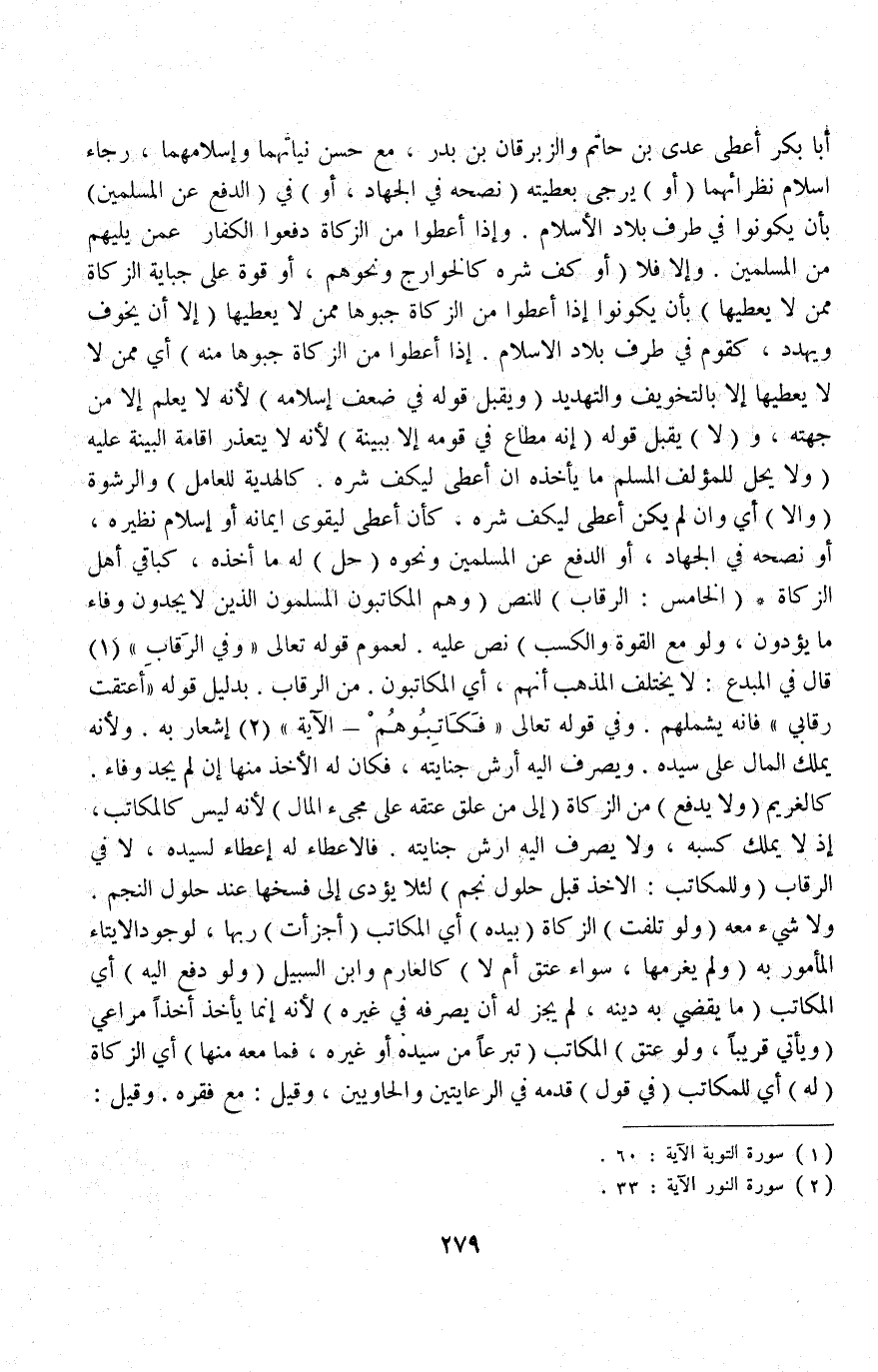 أَبَا بَكْرٍ أَعْطَى عَدِيَّ بْنَ حَاتِمٍ وَالزِّبْرِقَانَ بْنَ بَدْرٍ مَعَ حُسْنِ نِيَّاتِهِمَا وَإِسْلَامِهِمَا رَجَاءَ إسْلَامِ نُظَرَائِهِمَا.