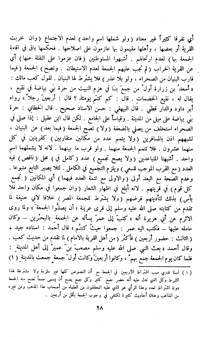 (الثَّالِثُ: حُضُورُ أَرْبَعِينَ فَأَكْثَرَ مِنْ أَهْلِ الْقَرْيَةِ بِالْإِمَامِ) لِمَا تَقَدَّمَ مِنْ حَدِيثِ كَعْبٍ وَقَالَ أَحْمَدُ «بَعَثَ النَّبِيُّ مُصْعَبَ بْنَ عُمَيْرٍ إلَى أَهْلِ الْمَدِينَةِ فَلَمَّا كَانَ يَوْمُ الْجُمُعَةِ جَمَعَ بِهِمْ، وَكَانُوا أَرْبَعِينَ وَكَانَتْ أَوَّلَ جُمُعَةٍ جُمِعَتْ بِالْمَدِينَةِ»
