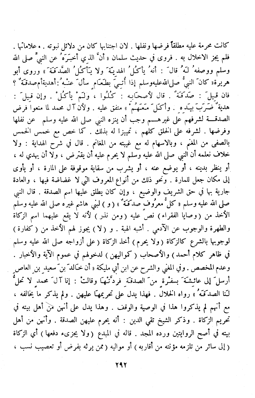 وَفِي الْمُغْنِي وَالشَّرْحِ عَنْ ابْنِ أَبِي مُلَيْكَةَ " أَنَّ خَالِدَ بْنَ سَعِيدِ بْنِ الْعَاصِ أَرْسَلَ إلَى عَائِشَةَ بِسُفْرَةٍ مِنْ الصَّدَقَةِ فَرَدَّتْهَا وَقَالَتْ: إنَّا آلَ مُحَمَّدٍ لَا تَحِلُّ لَنَا الصَّدَقَةُ " رَوَاهُ الْخَلَّالُ، فَهَذَا يَدُلُّ عَلَى تَحْرِيمِهَا عَلَيْهِنَّ وَلَمْ يُذْكَرْ مَا يُخَالِفُهُ، مَعَ أَنَّهُمْ لَمْ يَذْكُرُوا هَذَا فِي الْوَصِيَّةِ وَالْوَقْفِ، وَهَذَا يَدُلُّ عَلَى أَنَّهُنَّ مِنْ أَهْلِ بَيْتِهِ فِي تَحْرِيمِ الزَّكَاةِ، وَذَكَرَ الشَّيْخُ تَقِيُّ الدِّينِ: أَنَّهُ يَحْرُمُ عَلَيْهِنَّ الصَّدَقَةُ، وَأَنَّهُنَّ مِنْ أَهْلِ بَيْتِهِ فِي أَصَحِّ الرِّوَايَتَيْنِ وَرَدَّهُ الْمَجْدُ، قَالَهُ فِي الْمُبْدِعِ.