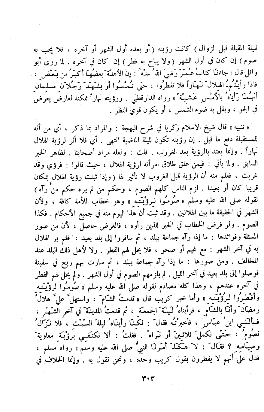 (وَلَا يُبَاحُ بِهِ فِطْرٌ) إنْ كَانَ فِي آخِرِهِ لِمَا رَوَى أَبُو وَائِلٍ قَالَ: " جَاءَنَا كِتَابُ عُمَرَ - رَضِيَ اللَّهُ عَنْهُ -: إنَّ الْأَهِلَّةَ بَعْضُهَا أَكْبَرُ مِنْ بَعْضٍ فَإِذَا رَأَيْتُمْ الْهِلَالَ نَهَارًا فَلَا تُفْطِرُوا حَتَّى تُمْسُوا أَوْ يَشْهَدَ رَجُلَانِ مُسْلِمَانِ أَنَّهُمَا رَأَيَاهُ بِالْأَمْسِ عَشِيَّةً " رَوَاهُ الدَّارَقُطْنِيّ وَرُؤْيَتُهُ نَهَارًا مُمْكِنَةٌ لِعَارِضٍ يَعْرِضُ فِي الْجَوِّ وَيَقِلُّ بِهِ ضَوْءُ الشَّمْسِ أَوْ يَكُونُ قَوِيَّ النَّظَرِ " تَنْبِيهٌ " قَالَ شَيْخُ الْإِسْلَامِ زَكَرِيَّا فِي شَرْحِ الْبَهْجَةِ: وَالْمُرَادُ بِمَا ذُكِرَ أَيْ: مِنْ أَنَّهُ لِلْمُسْتَقْبَلَةِ دَفْعُ مَا قِيلَ إنَّ رُؤْيَتَهُ تَكُونُ لِلَّيْلَةِ الْمَاضِيَةِ انْتَهَى أَيْ: فَلَا أَثَرَ لِرُؤْيَةِ الْهِلَالِ نَهَارًا، وَإِنَّمَا يُعْتَدُّ بِالرُّؤْيَةِ بَعْدَ الْغُرُوبِ قُلْتُ: وَلَعَلَّهُ مُرَادُ أَصْحَابِنَا لِظَاهِرِ الْخَبَرِ السَّابِقِ وَلِمَا يَأْتِي فِيمَنْ عَلَّقَ طَلَاقَ امْرَأَتِهِ لِرُؤْيَةِ الْهِلَالِ، حَيْثُ قَالُوا: فَرُئِيَ وَقَدْ غَرَبَتْ، فَعُلِمَ مِنْهُ أَنَّ الرُّؤْيَةَ قَبْلَ الْغُرُوبِ لَا تَأْثِيرَ لَهَا.