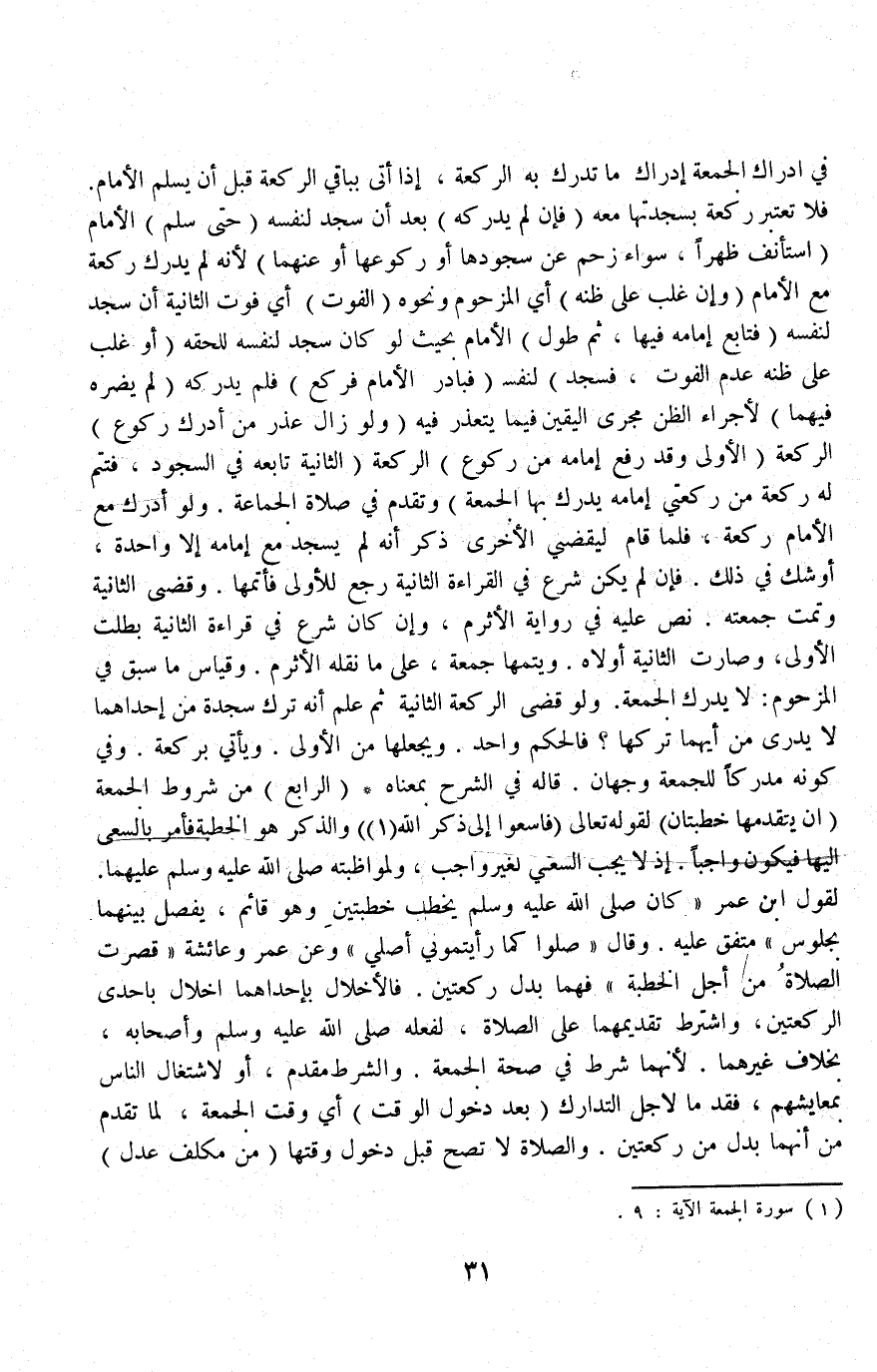 فِي إدْرَاكِ الْجُمُعَةِ إدْرَاكُ مَا تُدْرَكُ بِهِ الرَّكْعَةُ، إذَا أَتَى بِبَاقِي الرَّكْعَةِ قَبْلَ أَنْ يُسَلِّمَ الْإِمَامُ فَلَا تُعْتَبَرُ رَكْعَةٌ بِسَجْدَتِهَا مَعَهُ (فَإِنْ لَمْ يُدْرِكْهُ) بَعْدَ أَنْ سَجَدَ لِنَفْسِهِ (حَتَّى سَلَّمَ) الْإِمَامُ (اسْتَأْنَفَ ظُهْرًا سَوَاءٌ زُحِمَ عَنْ سُجُودِهَا أَوْ رُكُوعِهَا أَوْ عَنْهُمَا) لِأَنَّهُ لَمْ يُدْرِكْ رَكْعَةً مَعَ الْإِمَامِ.