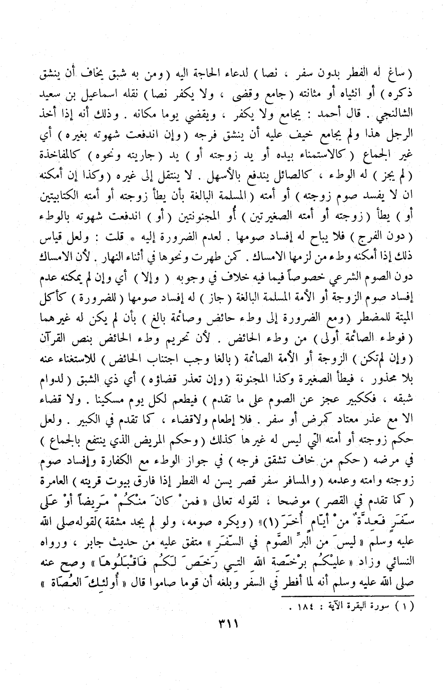 (وَكَذَا إنْ أَمْكَنَهُ أَنْ لَا يُفْسِدَ صَوْمَ زَوْجَتِهِ) أَوْ أَمَتِهِ (الْمُسْلِمَةِ الْبَالِغَةِ بِأَنْ يَطَأَ زَوْجَتَهُ أَوْ أَمَتَهُ الْكِتَابِيَّتَيْنِ أَوْ) يَطَأَ (زَوْجَتَهُ أَوْ أَمَتَهُ الصَّغِيرَتَيْنِ) أَوْ الْمَجْنُونَتَيْنِ (أَوْ) انْدَفَعْت شَهْوَتَهُ بِالْوَطْءِ (دُونَ الْفَرْجِ) فَلَا يُبَاحُ لَهُ إفْسَادُ صَوْمِهَا لِعَدَمِ الضَّرُورَةِ إلَيْهِ، قُلْتُ: وَلَعَلَّ قِيَاسَ ذَلِكَ إذَا أَمْكَنَهُ وَطْءُ مَنْ لَزِمَهَا الْإِمْسَاكُ كَمَنْ طَهُرَتْ وَنَحْوِهَا فِي أَثْنَاءِ النَّهَارِ؛ لِأَنَّ الْإِمْسَاكَ دُونَ الصَّوْمِ الشَّرْعِيِّ خُصُوصًا فِيمَا فِيهِ خِلَافٌ فِي وُجُوبِهِ (وَإِلَّا) أَيْ: وَإِنْ لَمْ يُمْكِنْهُ عَدَمُ إفْسَادِ صَوْمِ الزَّوْجَةِ أَوْ الْأَمَةِ الْمُسْلِمَةِ الْبَالِغَةِ (جَازَ) لَهُ إفْسَادُ صَوْمِهَا (لِلضَّرُورَةِ) كَأَكْلِ الْمَيْتَةِ لِلْمُضْطَرِّ.