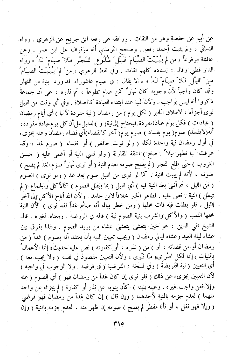 وَفِي لَفْظٍ لِلزُّهْرِيِّ «مَنْ لَمْ يُبَيِّتْ الصِّيَامَ مِنْ اللَّيْلِ فَلَا صِيَامَ لَهُ» لَا يُقَالُ: فِي صِيَامِ عَاشُورَاءَ قَدْ وَرَدَ بِنِيَّةٍ مِنْ النَّهَارِ وَقَدْ كَانَ وَاجِبًا؛ لِأَنَّ وُجُوبَهُ كَانَ نَهَارًا كَمَنْ صَامَ تَطَوُّعًا ثُمَّ نَذَرَهُ عَلَى أَنَّ جَمَاعَةً ذَكَرُوا أَنَّهُ لَيْسَ بِوَاجِبٍ؛ وَلِأَنَّ النِّيَّةَ عِنْدَ ابْتِدَاءِ الْعِبَادَةِ كَالصَّلَاةِ وَفِي أَيِّ وَقْتٍ مِنْ اللَّيْلِ نَوَى أَجْزَأَهُ؛ لِإِطْلَاقِ الْخَبَرِ.