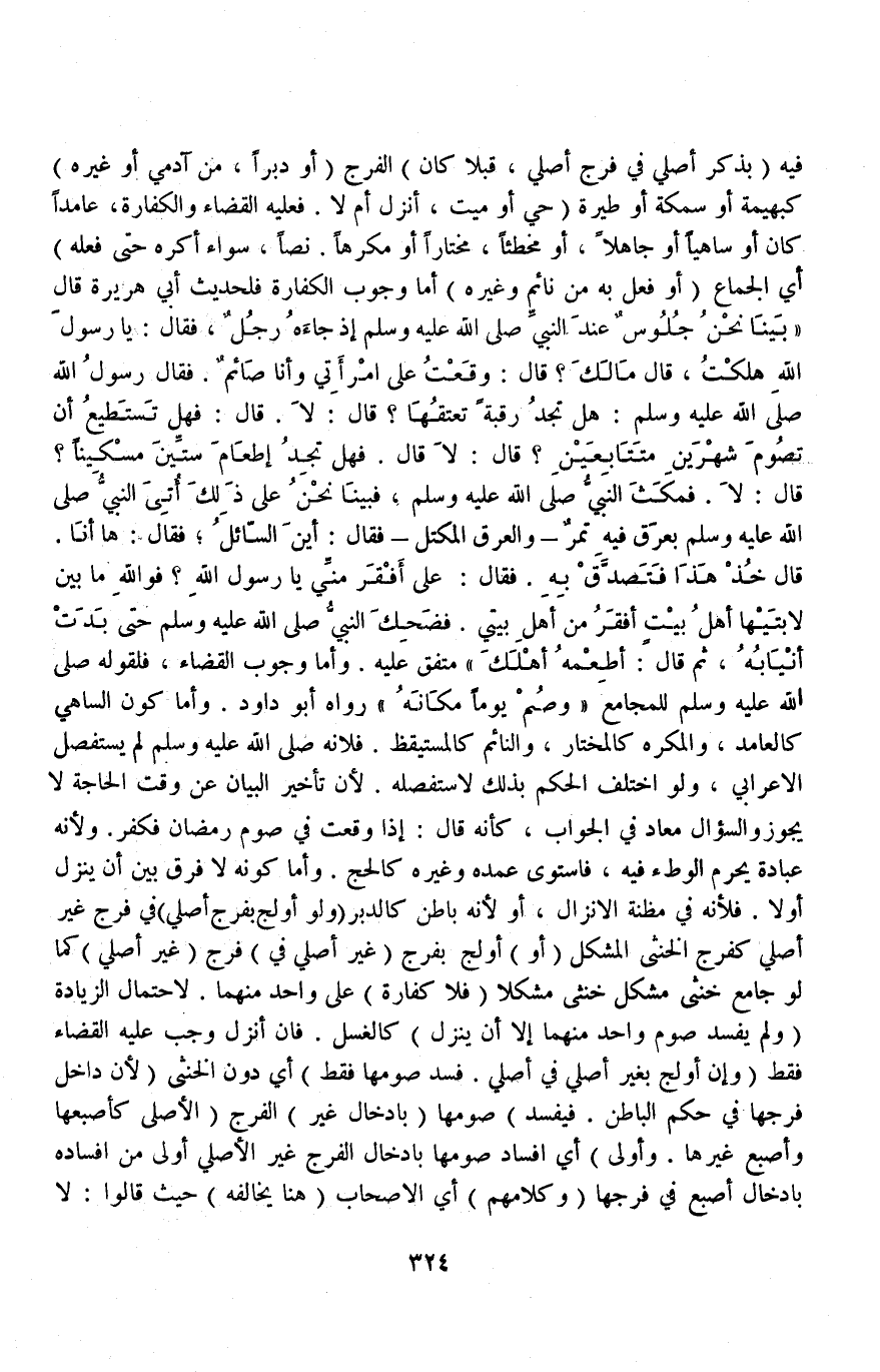 فِيهِ (بِذَكَرٍ أَصْلِيٍّ فِي فَرْجٍ أَصْلِيٍّ قُبُلًا كَانَ) الْفَرْجُ (أَوْ دُبُرًا مِنْ آدَمِيٍّ أَوْ غَيْرِهِ) كَبَهِيمَةٍ أَوْ سَمَكَةٍ أَوْ طَيْرَةٍ (حَيٍّ أَوْ مَيِّتٍ أَنْزَلَ أَمْ لَا، فَعَلَيْهِ الْقَضَاءُ وَالْكَفَّارَةُ عَامِدًا كَانَ أَوْ سَاهِيًا أَوْ جَاهِلًا أَوْ مُخْطِئًا مُخْتَارًا أَوْ مُكْرَهًا نَصًّا، سَوَاءٌ أُكْرِهَ حَتَّى فَعَلَهُ) أَيْ الْجِمَاعَ (أَوْ فُعِلَ بِهِ مِنْ نَائِمٍ وَغَيْرِهِ) أَمَّا وُجُوبُ الْكَفَّارَةِ فَلِحَدِيثِ أَبِي هُرَيْرَةَ قَالَ: «بَيْنَا نَحْنُ جُلُوسٌ عِنْدَ النَّبِيِّ - صَلَّى اللَّهُ عَلَيْهِ وَسَلَّمَ - إذْ جَاءَهُ رَجُلٌ فَقَالَ: يَا رَسُولَ اللَّهِ هَلَكْتُ قَالَ: مَالَكَ؟ قَالَ: وَقَعْتُ عَلَى امْرَأَتِي وَأَنَا صَائِمٌ فَقَالَ رَسُولُ اللَّهِ - صَلَّى اللَّهُ عَلَيْهِ وَسَلَّمَ - هَلْ تَجِدُ رَقَبَةً تُعْتِقُهَا؟ قَالَ: لَا، قَالَ: فَهَلْ تَسْتَطِيعُ أَنْ تَصُومَ شَهْرَيْنِ مُتَتَابِعَيْنِ؟ قَالَ: لَا، قَالَ: فَهَلْ تَجِدُ إطْعَامَ سِتِّينَ مِسْكِينًا؟ قَالَ: لَا، فَمَكَثَ النَّبِيُّ - صَلَّى اللَّهُ عَلَيْهِ وَسَلَّمَ - فَبَيْنَا نَحْنُ عَلَى ذَلِكَ أُتِيَ النَّبِيُّ - صَلَّى اللَّهُ عَلَيْهِ وَسَلَّمَ - بِعَرَقٍ فِيهِ تَمْرٌ، وَالْعَرَقُ الْمِكْتَلُ فَقَالَ: أَيْنَ السَّائِلُ؟ فَقَالَ: هَا أَنَا قَالَ: خُذْ هَذَا فَتَصَدَّقْ بِهِ فَقَالَ: عَلَى أَفْقَرَ مِنِّي يَا رَسُولَ اللَّهِ؟ فَوَاَللَّهِ مَا بَيْنَ لَابَتَيْهَا أَهْلُ بَيْتٍ أَفْقَرُ مِنْ أَهْلِ بَيْتِي فَضَحِكَ النَّبِيُّ - صَلَّى اللَّهُ عَلَيْهِ وَسَلَّمَ - حَتَّى بَدَتْ أَنْيَابُهُ ثُمَّ قَالَ: أَطْعِمْهُ أَهْلَكَ» مُتَّفَقٌ عَلَيْهِ.