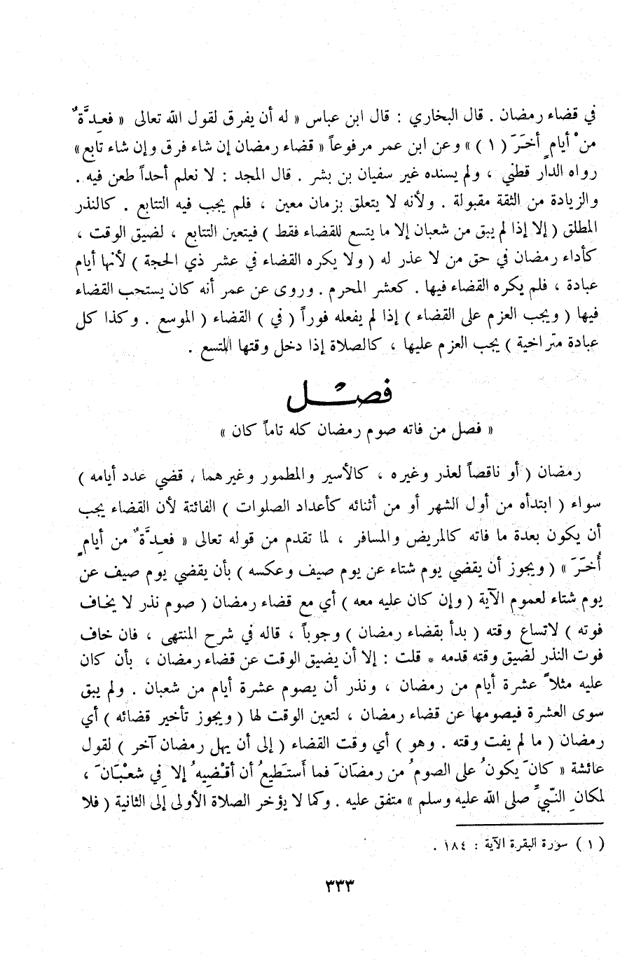 فِي قَضَاءِ رَمَضَانَ قَالَ الْبُخَارِيُّ قَالَ ابْنُ عَبَّاسٍ: لَهُ أَنْ يُفَرِّقَ لِقَوْلِ اللَّهِ تَعَالَى {فَعِدَّةٌ مِنْ أَيَّامٍ أُخَرَ} [البقرة: ١٨٤] وَعَنْ ابْنِ عُمَرَ مَرْفُوعًا «قَضَاءُ رَمَضَانَ إنْ شَاءَ فَرَّقَ وَإِنْ شَاءَ تَابَعَ» رَوَاهُ الدَّارَقُطْنِيّ وَلَمْ يُسْنِدْهُ غَيْرُ سُفْيَانِ بْنِ بِشْرٍ قَالَ الْمَجْدُ: لَا نَعْلَمُ أَحَدًا طَعَنَ فِيهِ وَالزِّيَادَةُ مِنْ الثِّقَةِ مَقْبُولَةٌ؛ وَلِأَنَّهُ لَا يَتَعَلَّقُ بِزَمَانٍ مُعَيَّنٍ فَلَمْ يَجِبْ فِيهِ التَّتَابُعُ كَالنَّذْرِ الْمُطْلَقِ (إلَّا إذَا لَمْ يَبْقَ مِنْ شَعْبَانَ إلَّا مَا يَتَّسِعُ لِلْقَضَاءِ فَقَطْ) فَيَتَعَيَّنُ التَّتَابُعُ لِضِيقِ الْوَقْتِ، كَأَدَاءِ رَمَضَانَ فِي حَقِّ مَنْ لَا عُذْرَ لَهُ، (وَلَا يُكْرَهُ الْقَضَاءُ فِي عَشْرِ ذِي الْحِجَّةِ) ؛ لِأَنَّهَا أَيَّامُ عِبَادَةٍ فَلَمْ يُكْرَهْ الْقَضَاءُ فِيهَا كَعَشْرِ الْمُحَرَّمِ وَرُوِيَ عَنْ عُمَرَ أَنَّهُ كَانَ يَسْتَحِبُّ الْقَضَاءَ فِيهَا.
