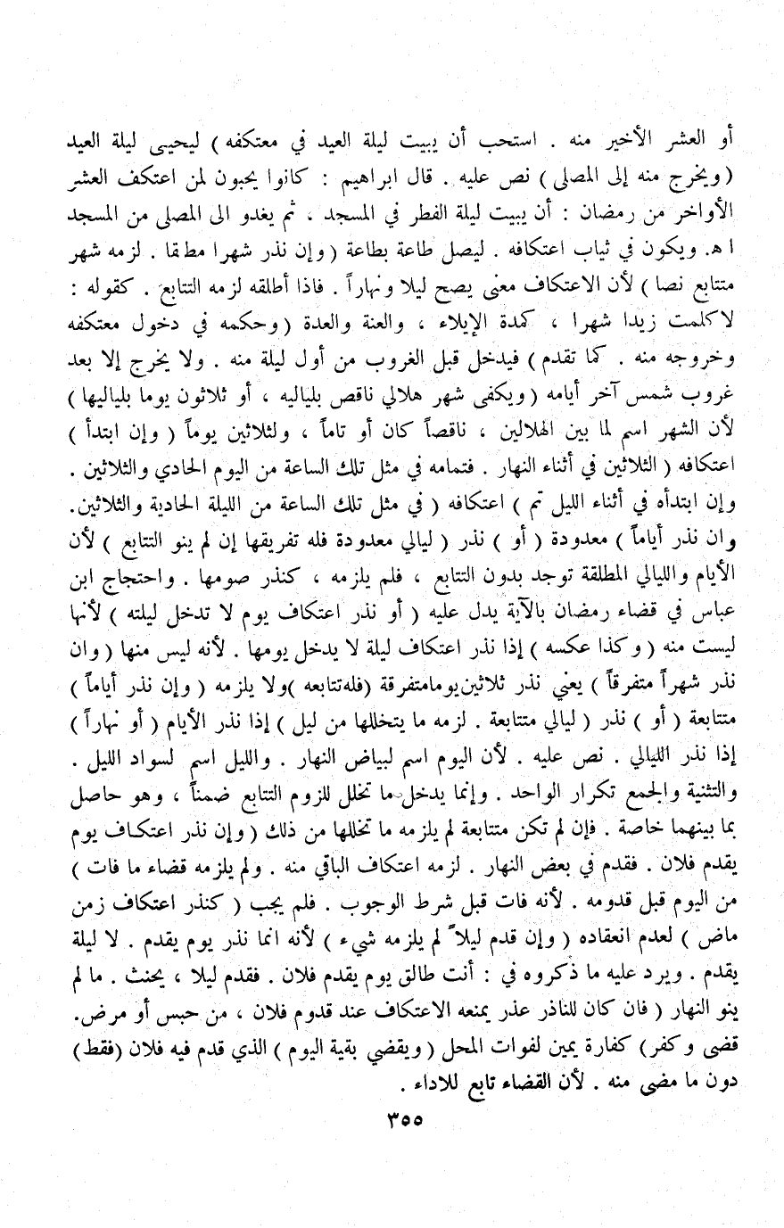 أَوْ الْعَشْرَ الْأَخِيرَ مِنْهُ اُسْتُحِبَّ أَنْ يَبِيتَ لَيْلَةَ الْعِيدِ فِي مُعْتَكَفِهِ) لِيُحْيِيَ لَيْلَةَ الْعِيدِ (وَيَخْرُجَ مِنْهُ إلَى الْمُصَلَّى) نَصَّ عَلَيْهِ قَالَ إبْرَاهِيمُ: كَانُوا يُحِبُّونَ لِمَنْ اعْتَكَفَ الْعَشْرَ الْأَوَاخِرَ مِنْ رَمَضَانَ أَنْ يَبِيتَ لَيْلَةَ الْفِطْرِ فِي الْمَسْجِدِ ثُمَّ يَغْدُو إلَى الْمُصَلَّى مِنْ الْمَسْجِدِ اهـ وَيَكُونُ فِي ثِيَابِ اعْتِكَافِهِ لِيَصِلَ طَاعَةً بِطَاعَةٍ.