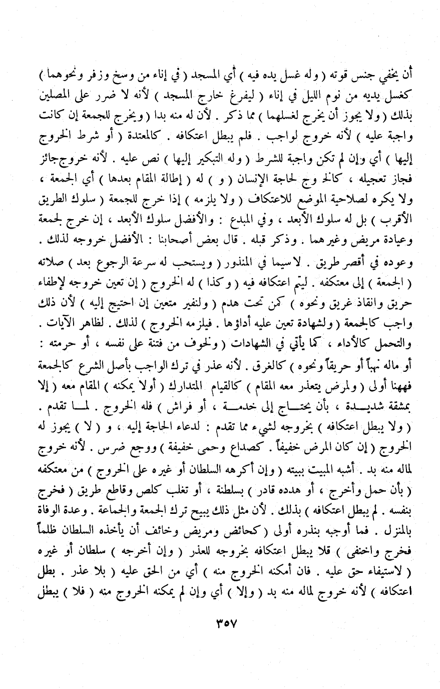 وَفِي الْمُبْدِعِ: وَالْأَفْضَلُ سُلُوكُ الْأَبْعَدِ إنْ خَرَجَ لِجُمُعَةٍ وَعِيَادَةِ مَرِيضٍ وَغَيْرِهِمَا، وَذُكِرَ قَبْلَهُ قَالَ بَعْضُ أَصْحَابِنَا: الْأَفْضَلُ خُرُوجُهُ لِذَلِكَ وَعَوْدُهُ فِي أَقْصَرِ طَرِيقٍ لَا سِيَّمَا فِي الْمَنْذُورِ (وَيُسْتَحَبُّ لَهُ سُرْعَةُ الرُّجُوعِ بَعْدَ) صَلَاتِهِ (الْجُمُعَةَ) إلَى مُعْتَكَفِهِ لِيُتِمَّ اعْتِكَافَهُ فِيهِ، (وَكَذَا) لَهُ الْخُرُوجُ (إنْ تَعَيَّنَ خُرُوجُهُ لِإِطْفَاءِ حَرِيقٍ وَإِنْقَاذِ غَرِيقٍ وَنَحْوِهِ) كَمَنْ تَحْتَ هَدْمٍ (وَلِنَفِيرٍ مُتَعَيَّنٍ إنْ اُحْتِيجَ إلَيْهِ) ؛؛ لِأَنَّ ذَلِكَ وَاجِبٌ كَالْجُمُعَةِ (وَلِشَهَادَةٍ تَعَيَّنَ عَلَيْهِ أَدَاؤُهَا فَيَلْزَمُهُ الْخُرُوجُ) لِذَلِكَ لِظَاهِرِ الْآيَاتِ وَالتَّحَمُّلِ كَالْأَدَاءِ كَمَا يَأْتِي فِي الشَّهَادَاتِ (وَلِخَوْفٍ مِنْ فِتْنَةٍ عَلَى نَفْسِهِ أَوْ حُرْمَتِهِ: أَوْ مَالِهِ نَهْبًا أَوْ حَرِيقًا وَنَحْوِهِ) كَالْغَرَقِ؛ لِأَنَّهُ عُذِرَ فِي تَرْكِ الْوَاجِبِ بِأَصْلِ الشَّرْعِ كَالْجُمُعَةِ فَهَهُنَا أَوْلَى، (وَلِمَرَضٍ يَتَعَذَّرُ مَعَهُ الْمُقَامُ) كَالْقِيَامِ الْمُتَدَارَكِ (أَوْ لَا يُمْكِنُهُ) الْمُقَامُ مَعَهُ (إلَّا بِمَشَقَّةٍ شَدِيدَةٍ بِأَنْ يَحْتَاجَ إلَى خِدْمَةٍ أَوْ فِرَاشٍ) فَلَهُ الْخُرُوجُ لِمَا تَقَدَّمَ، (وَلَا يَبْطُلُ اعْتِكَافُهُ) بِخُرُوجِهِ لِشَيْءٍ مِمَّا تَقَدَّمَ: لِدُعَاءِ الْحَاجَةِ إلَيْهِ.